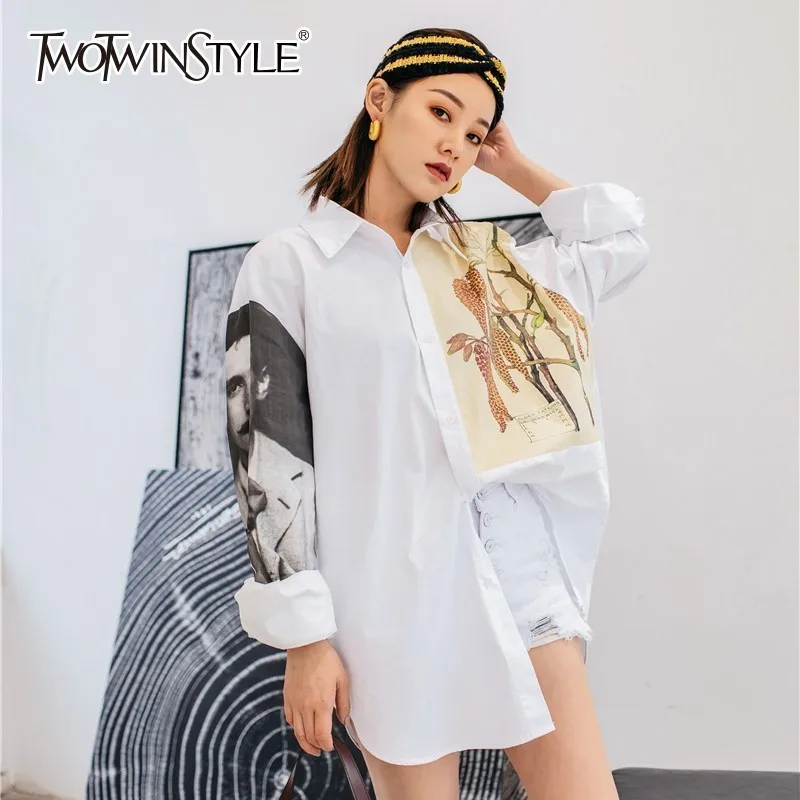 . (37% Off) Vente Deuxtwinstyle imprimer chemises pour femmes revers col à manches longues Hit couleur surdimensionné Blouse hauts femme printemps 2019 mode nouveau Pas Cher Prix.