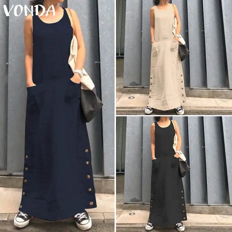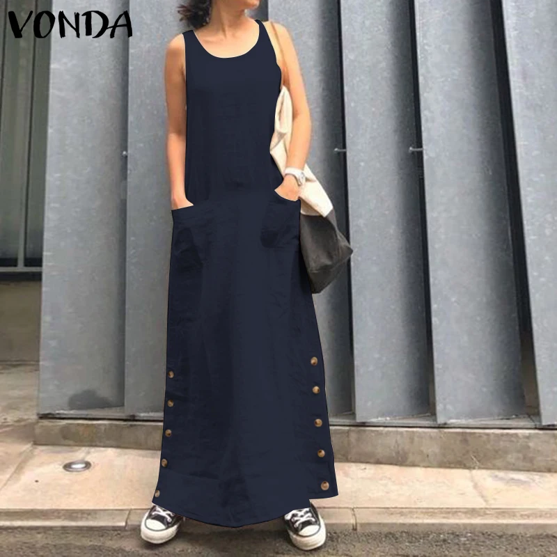 Special Offer VONDA Sexy solide Robe Maxi Club O cou sans manches longues robes femmes fête Robe Femme décontracté ample Sundress 2019 bohème 5XL Discount 30% Today!