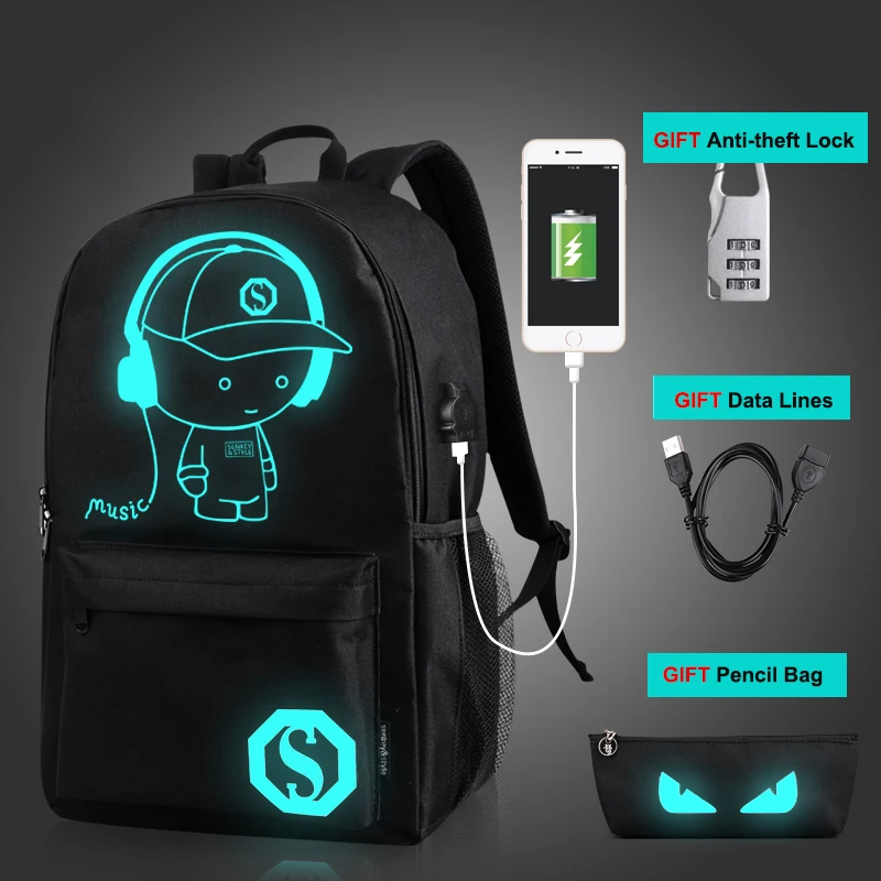 Product Name: 2018 Anti vol veilleuse sacs d école USB charge hommes sacs à dos lumineux Mochila mode Anime dessin animé étudiant école sac à dos