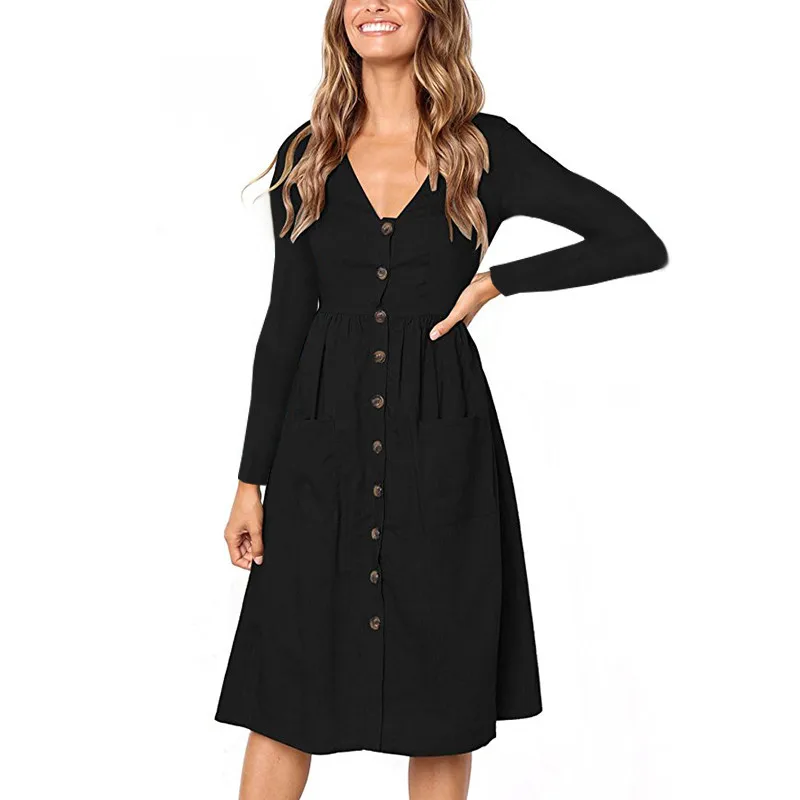Product Name: Col en v poches bouton robe femmes 2019 été printemps Midi chemise robe décontracté une ligne plage robe d été dames robe