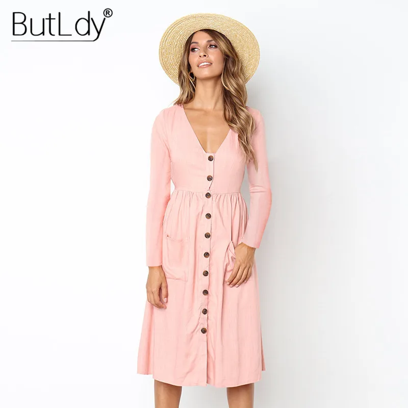 Special Offer Col en v poches bouton robe femmes 2019 été printemps Midi chemise robe décontracté une ligne plage robe d été dames robe Discount 45% Today!