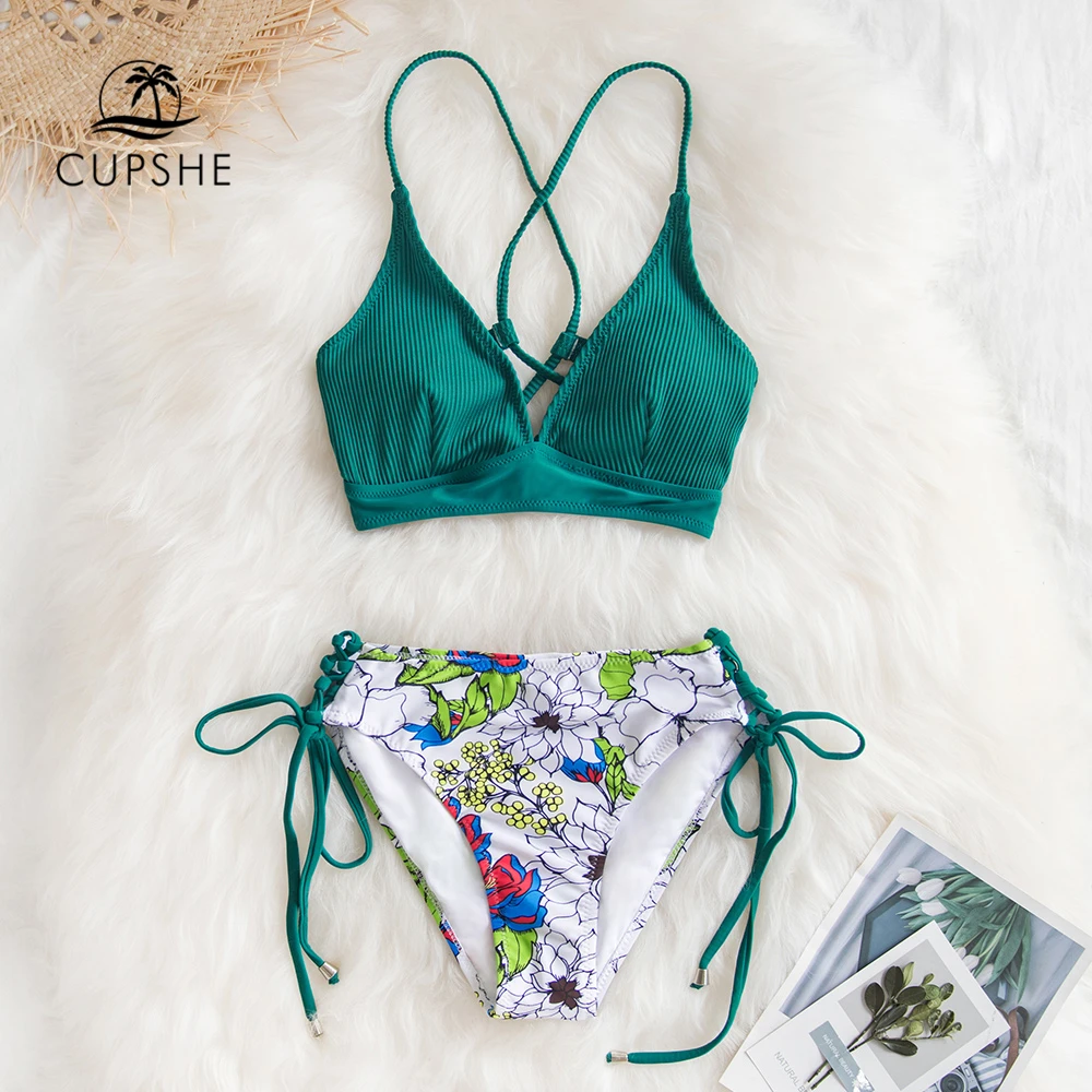Special Offer CUPSHE Sexy bleu et à fleurs à lacets Bikini ensembles femmes Boho col en v deux pièces maillots de bain 2019 fille plage maillot de bain maillots de bain Discount 45% Today!