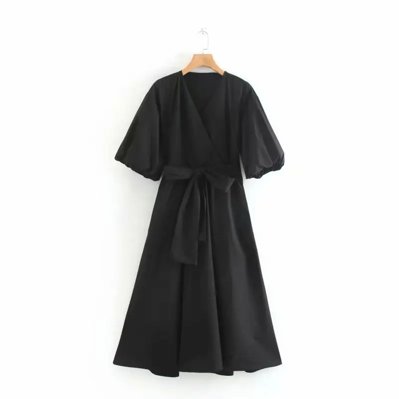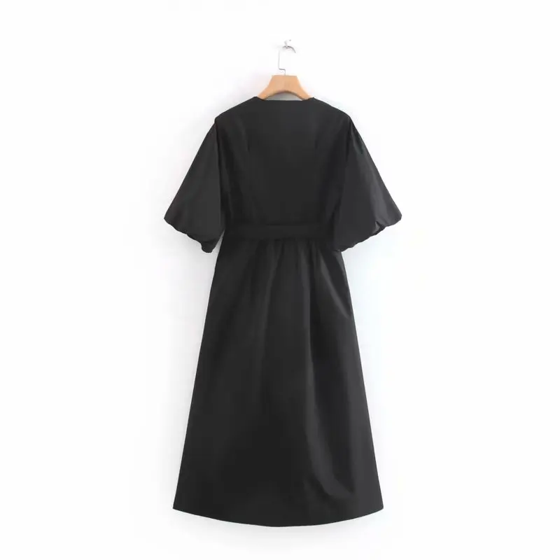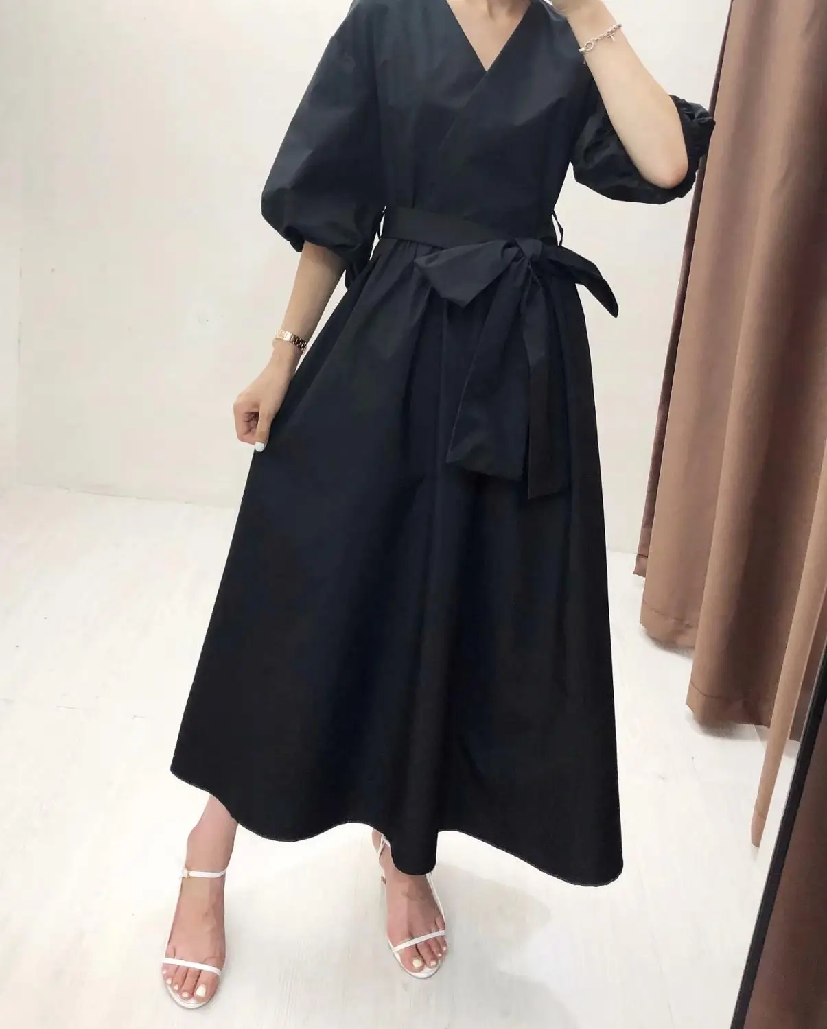 Product Name: 2019 femmes vintage lanterne manches noir vestidos croix col en v décontracté lâche robe mi longue chic élégant noeud papillon ceintures robes DS2681