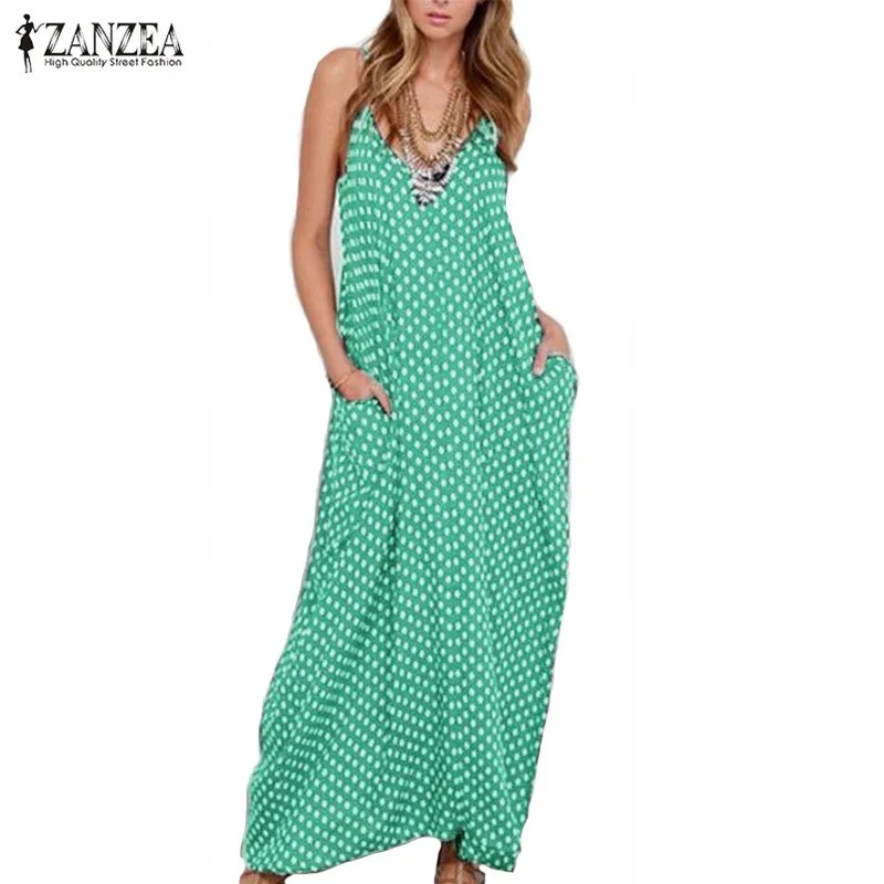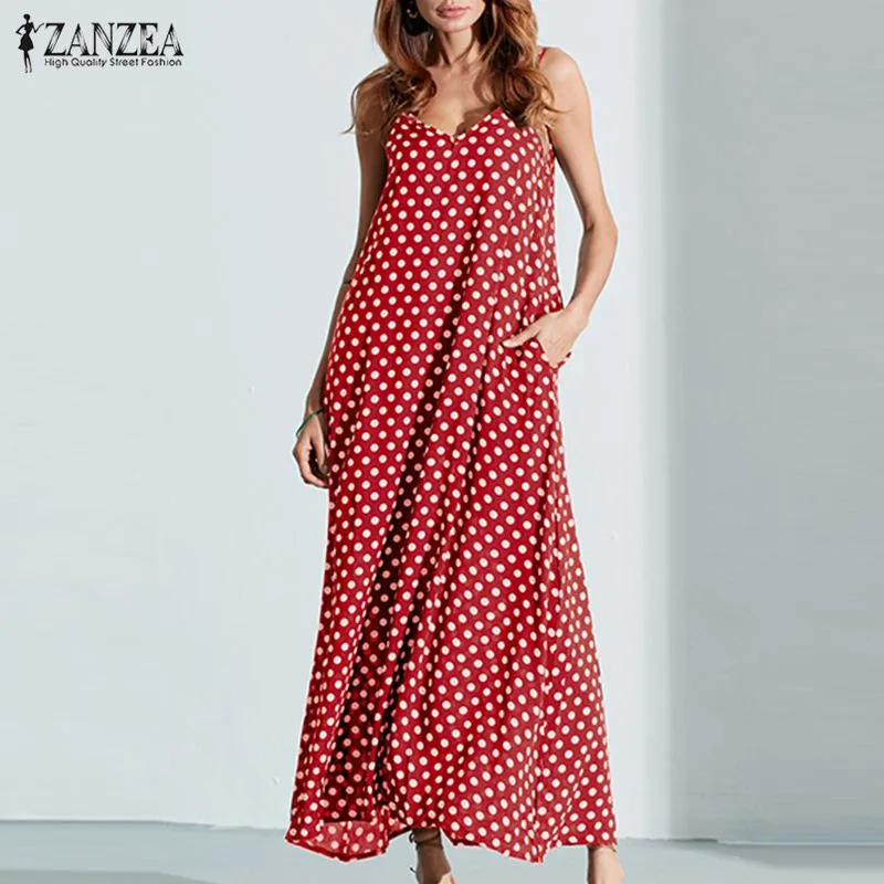 Special Offer S 6XL grande taille robe d été 2019 ZANZEA femmes à pois imprimé col en V sans manches robe d été lâche Maxi longue plage robe Vintage Discount 26% Today!