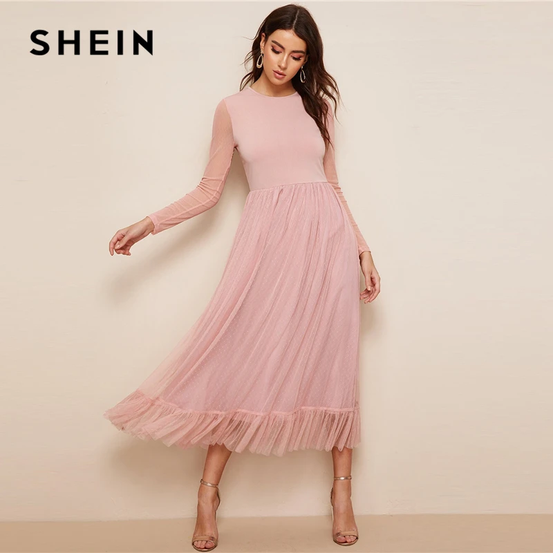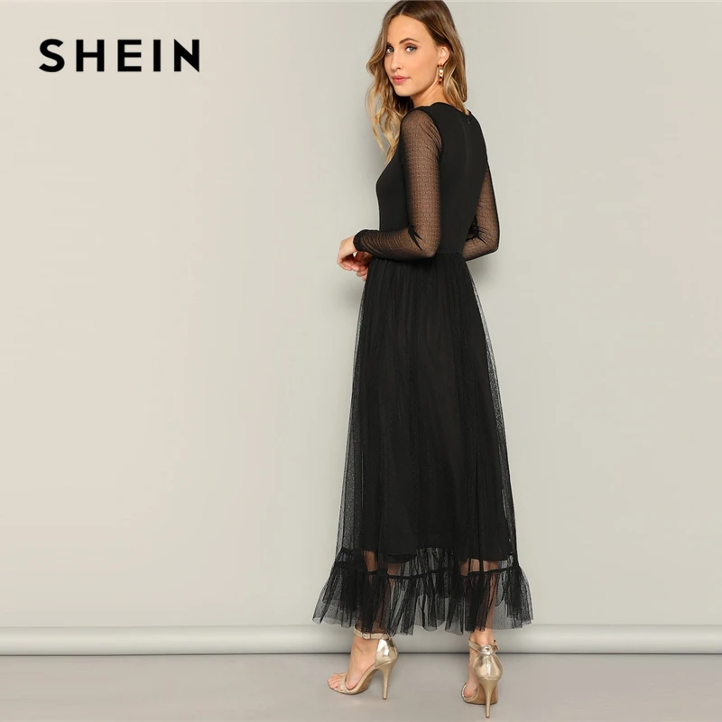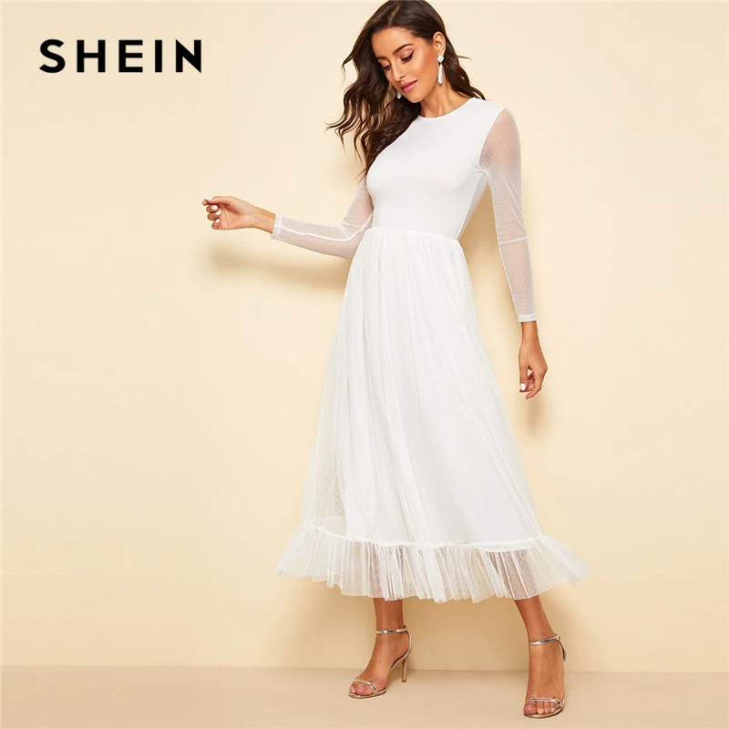 . (40% Off) Acheter SHEIN Fit et Flare Mesh superposition volants ourlet robe décontracté 2019 été col rond manches longues taille haute robes Pas Cher Prix.