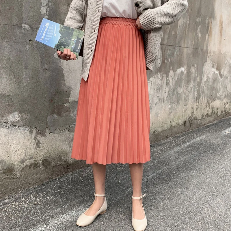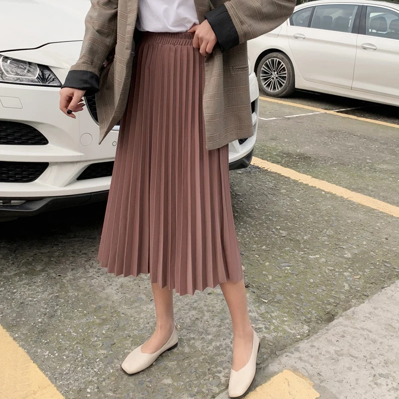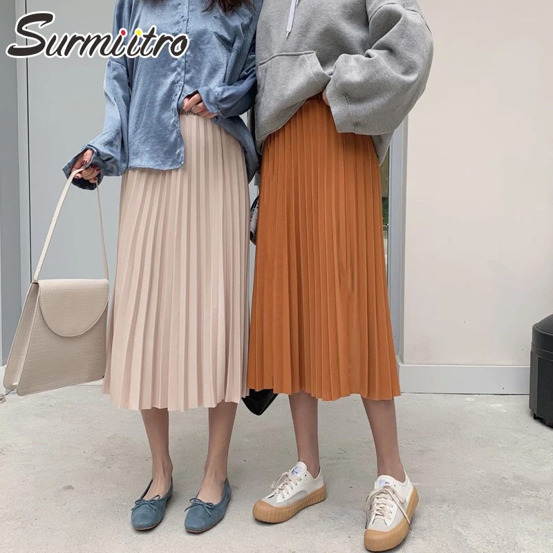 Product Name: Surmiitro élégant solide Midi jupe plissée femmes 2019 automne hiver dames coréenne taille haute a ligne école longue jupe femme