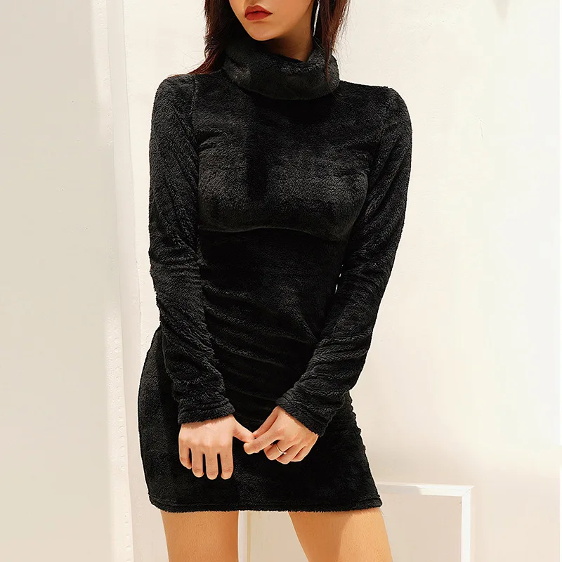 Product Name: Hugcitar fourrure velours col haut manches longues blanc moulante mini robe 2019 automne femmes fête streetwear chaud colthing