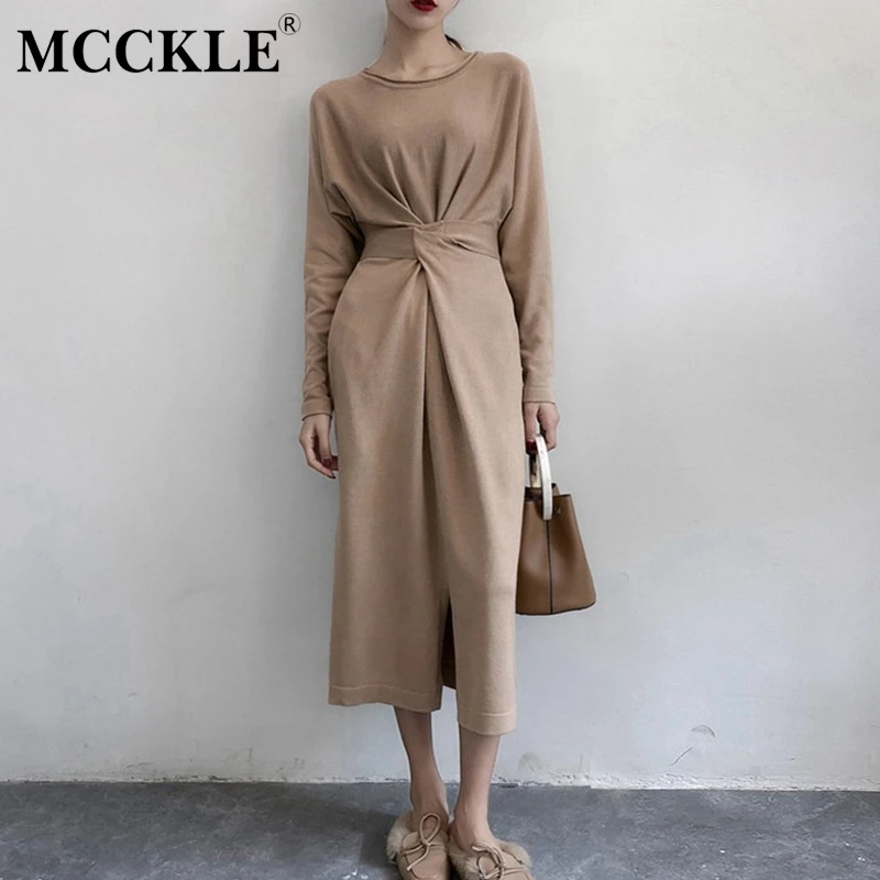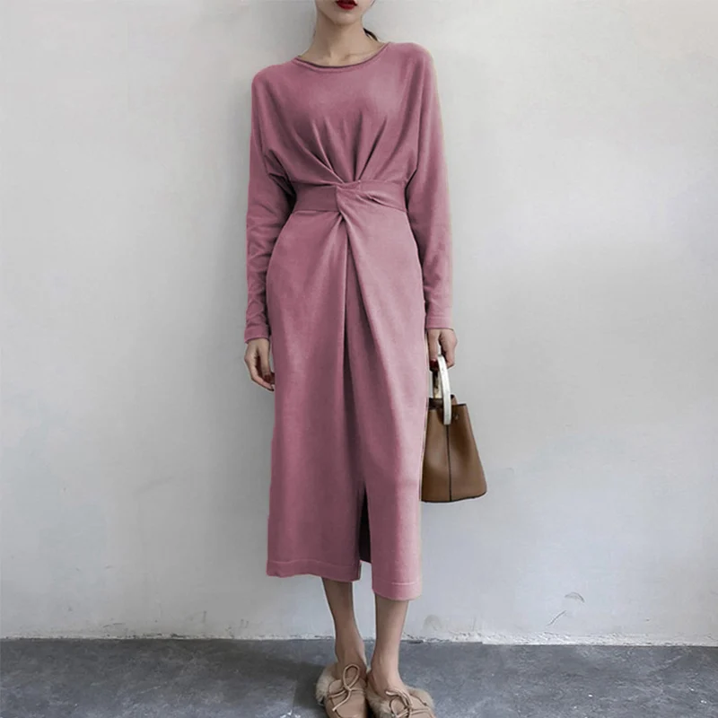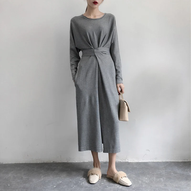 Special Offer Femmes à manches longues fendu tricoté a ligne robe Midi taille haute noeud papillon pansement à lacets robes féminines 2019 printemps o cou vêtements Discount 49% Today!