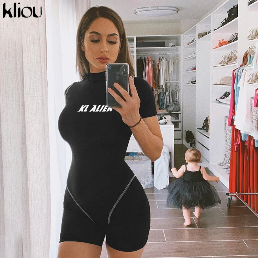 Special Offer Kliou femmes slim body à manches courtes combishort réfléchissant lettre imprimer barboteuses 2019 femme col roulé mode décontracté body Discount 50% Today!