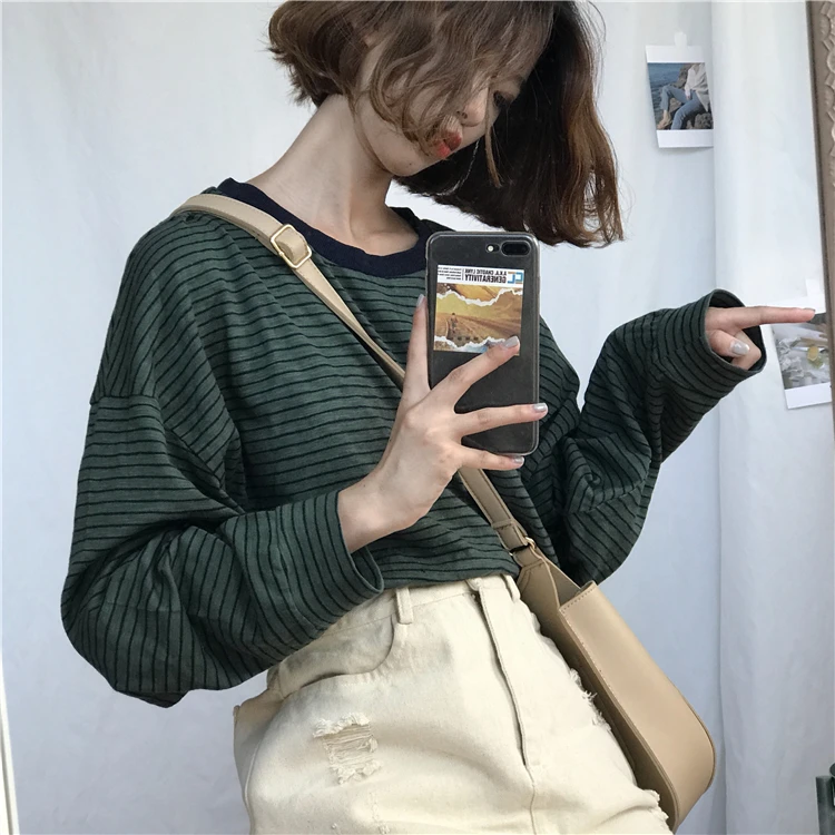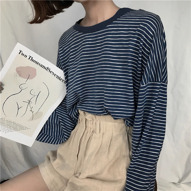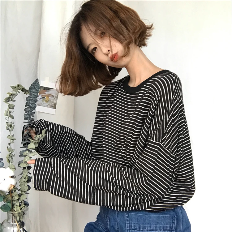 Special Offer YouGeMan T Shirt Femme 2019 printemps automne Style coréen Ulzzang Harajuku rétro à manches longues col rond rayé T shirt pour haut pour Femme Discount 9% Today!