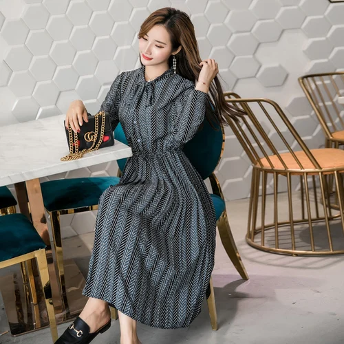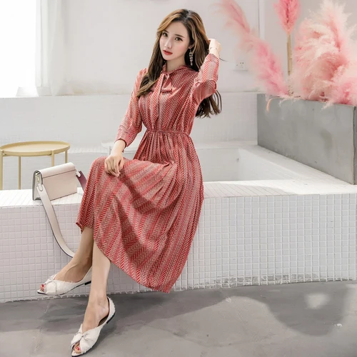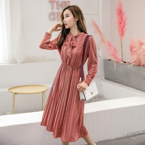 Product Name: Robe plissée automne 2019 à manches longues en mousseline de soie robe coréenne mode femmes vêtements doux arc col