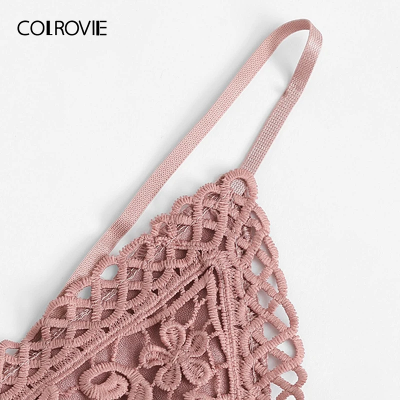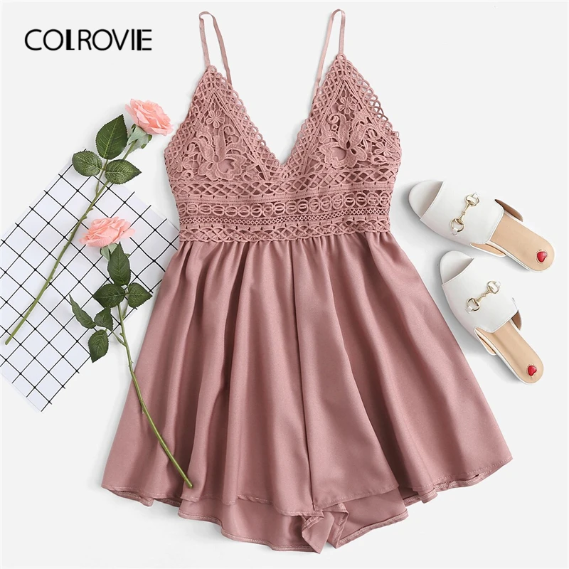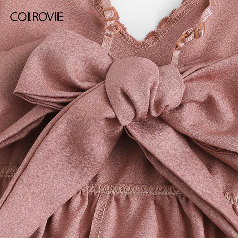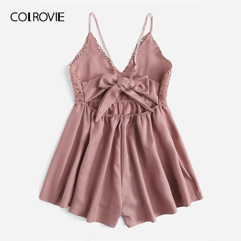 Special Offer COLROVIE rose solide col en V dos nu contraste dentelle noeud dos Cami Boho barboteuse femmes 2019 été Sexy Girly barboteuses combinaison courte Discount 40% Today!