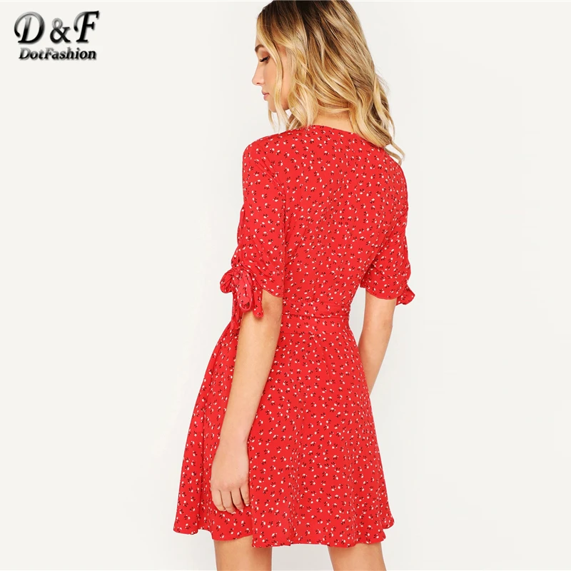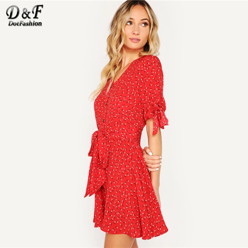 Special Offer Dotfashion rouge noeud manchette bouton Up Ditsy Floral ceinturé robe d été vêtements pour femmes 2019 col en V demi manches Boho robe coréenne Discount 45% Today!