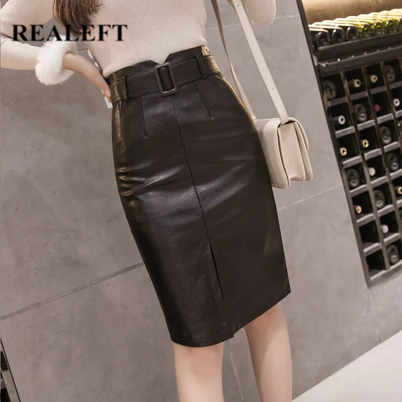 Special Offer REALEFT automne hiver OL élégant crayon Midi jupes taille haute cuir synthétique polyuréthane noir fendu gaine jupes porte feuille avec ceinture femme 2019 Discount 45% Today!