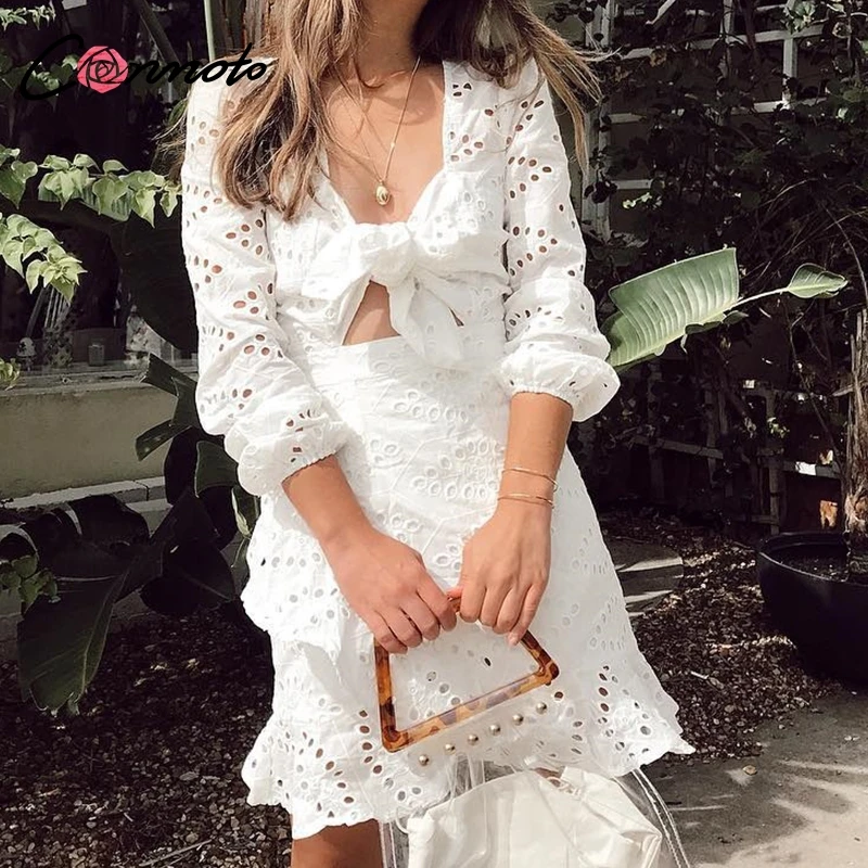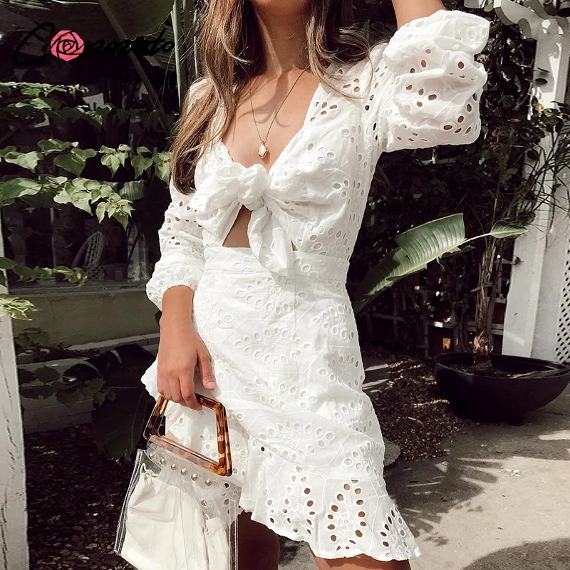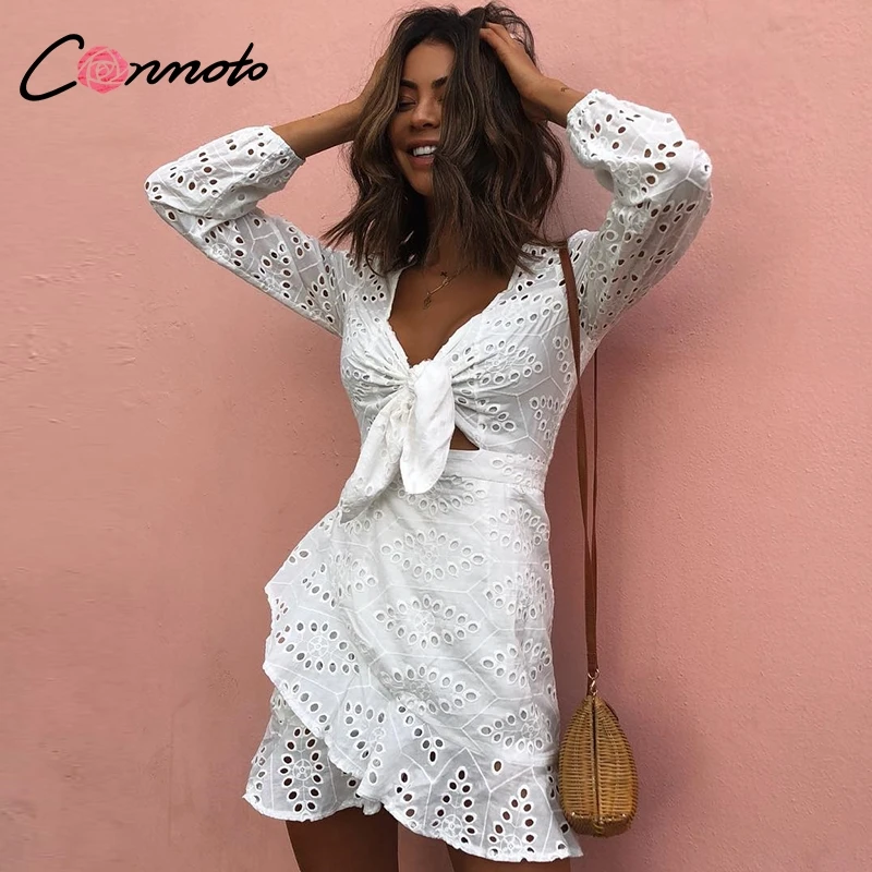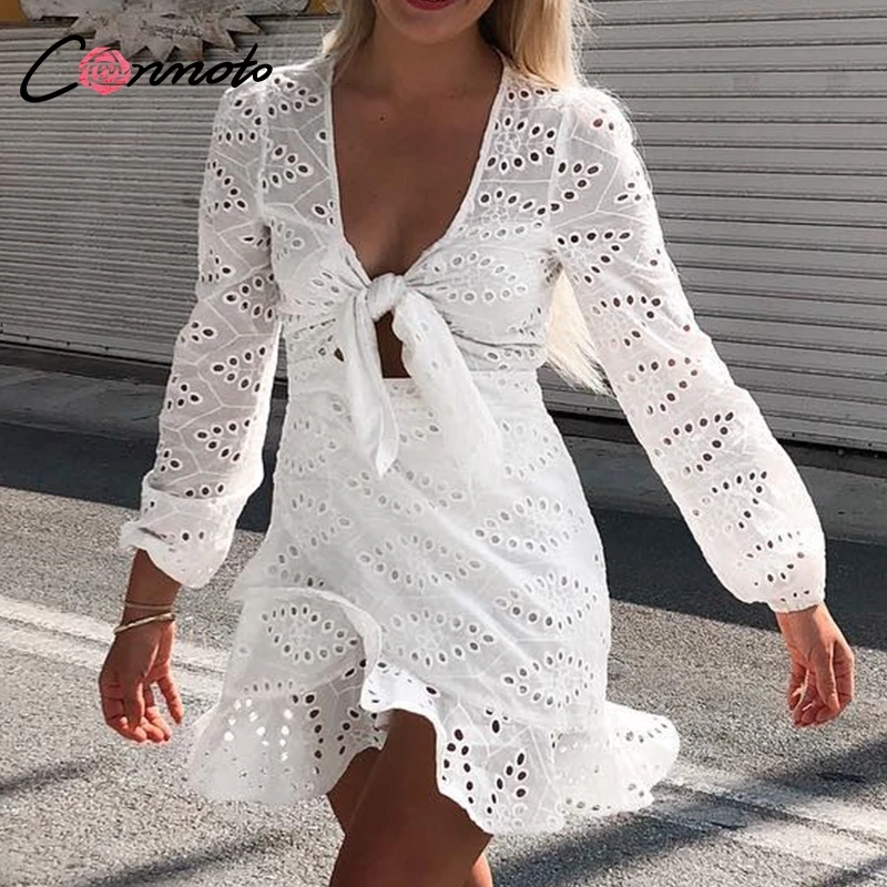 Product Name: Conmoto blanc broderie robe courte femmes Sexy col en V évider coton robe d hiver 2019 nouveau décontracté vacances à lacets Vestidos