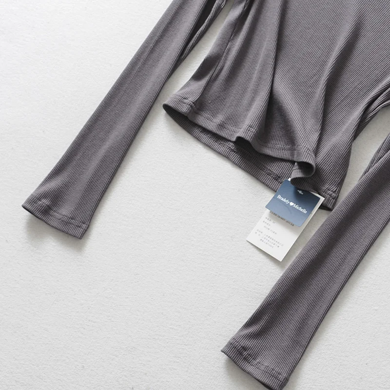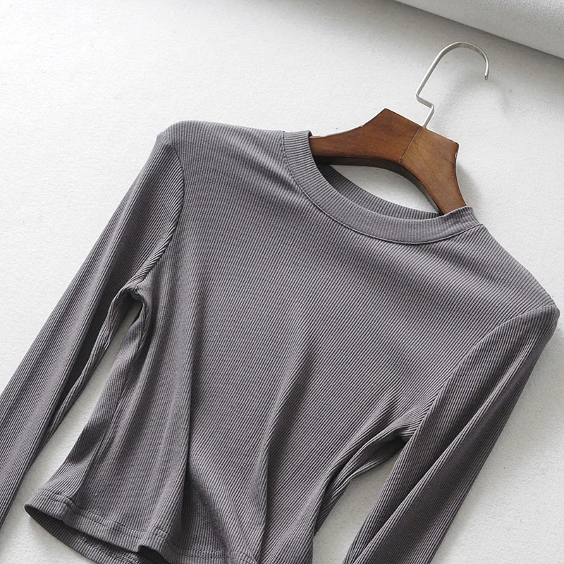 Product Name: BRADELY MICHELLE 2019 été sexy femmes col rond à manches longues T shirt slim élastique coton crop hauts
