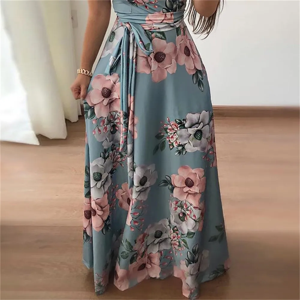 Product Name: Femmes longue Maxi robe 2019 été imprimé Floral Boho plage robe décontracté à manches courtes moulante Bandage robe de soirée Vestidos noir
