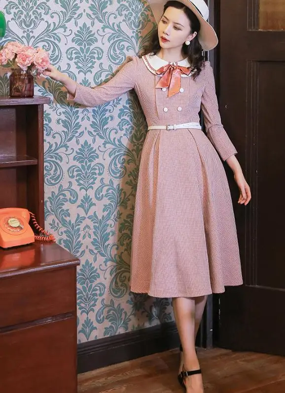 Special Offer Haute qualité 2019 printemps nouveauté rétro col claudine Plaid nœud papillon à manches longues femme longue robe en coton rose Discount 30% Today!
