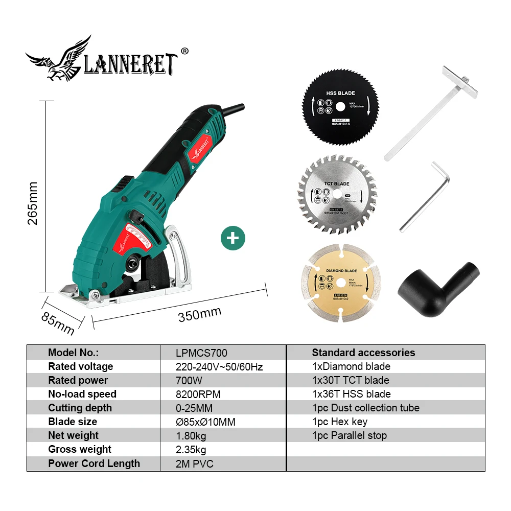 Product Name: LANNERET Mini scie circulaire électrique 700W Mini scie outil à main, scie à bois scie à métaux, outils de fixation de Guide parallèle, lames 3 pièces