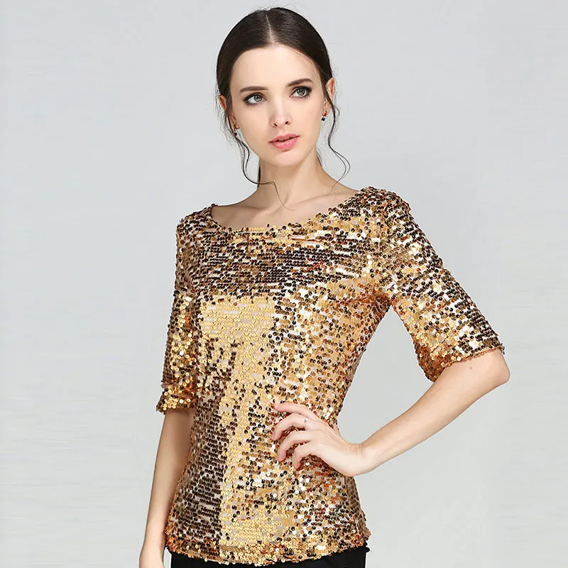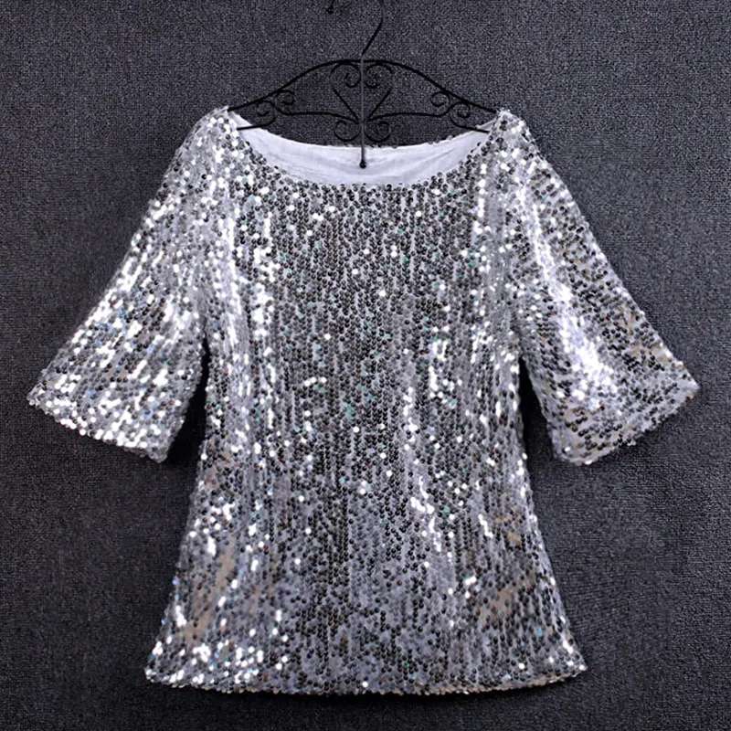Product Name: Willstage paillettes T shirts femmes demi manches chemises apporter hauts fête perles or argent noir t shirt Sequin 2018 printemps vêtements