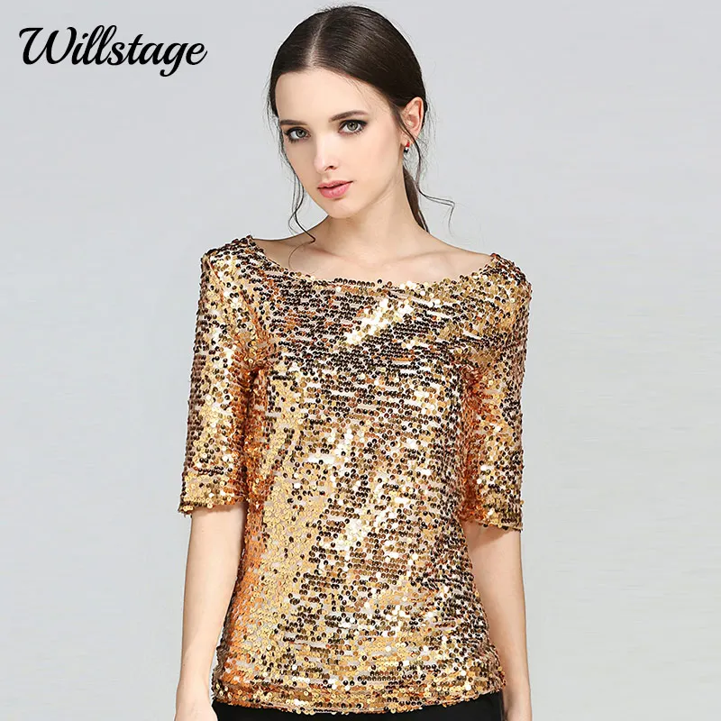 Special Offer Willstage paillettes T shirts femmes demi manches chemises apporter hauts fête perles or argent noir t shirt Sequin 2018 printemps vêtements Discount 40% Today!