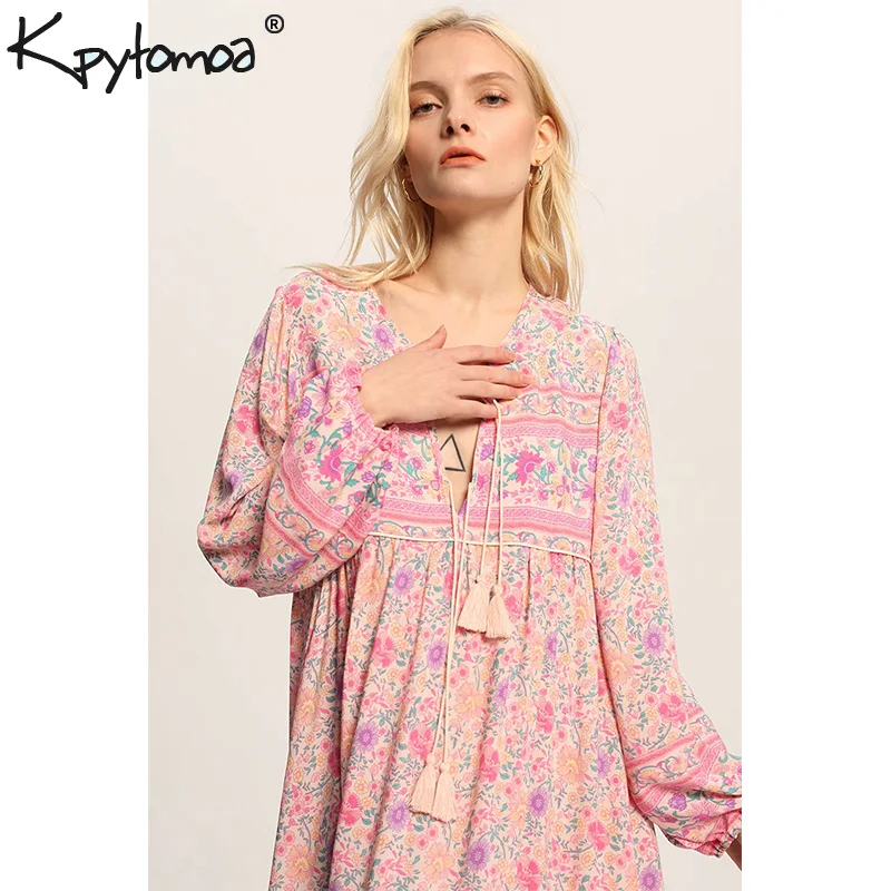 Special Offer Boho Chic été Vintage imprimé Floral plissé longue robe femmes 2019 mode col en V à lacets gland robes de plage Vestidos Mujer Discount 41% Today!