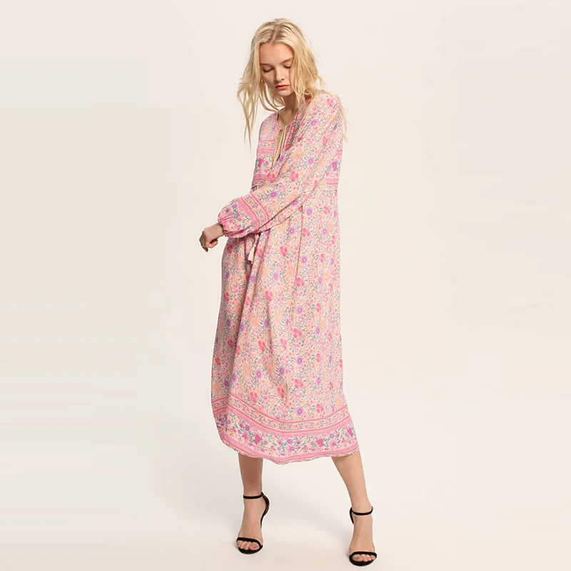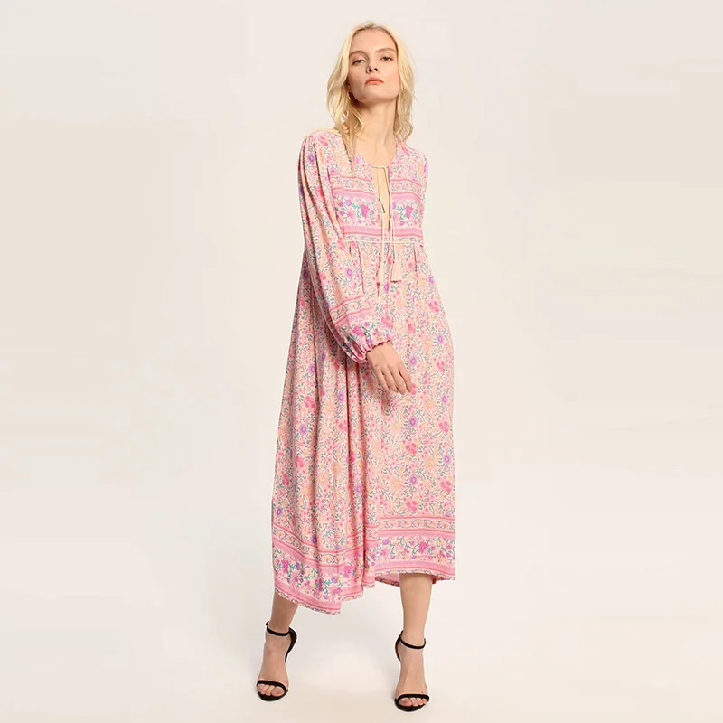 Product Name: Boho Chic été Vintage imprimé Floral plissé longue robe femmes 2019 mode col en V à lacets gland robes de plage Vestidos Mujer