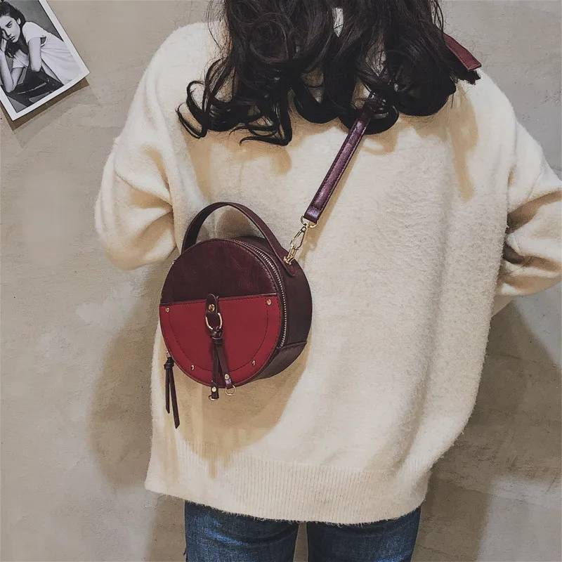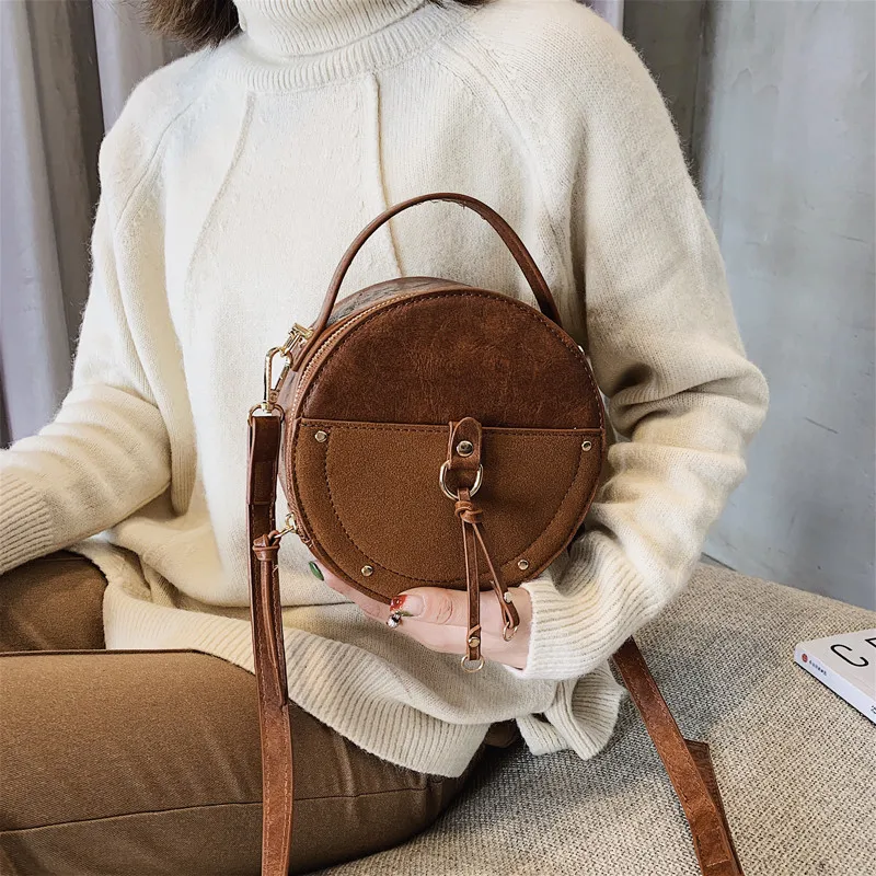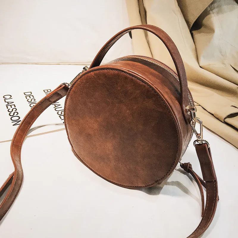 Product Name: 2019 nouveau Vintage petit sac rond gommage Pu sac à main en cuir pour les femmes mode Simple noir épaule Messenger sac dames Mini fourre tout