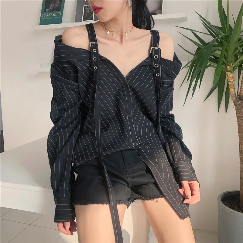 Special Offer LANMREM 2019 nouvelle personnalité de la mode sangle noire rayure verticale épaule dénudée chemise à manches longues chemisier femme Vestido YE22801 Discount 17% Today!