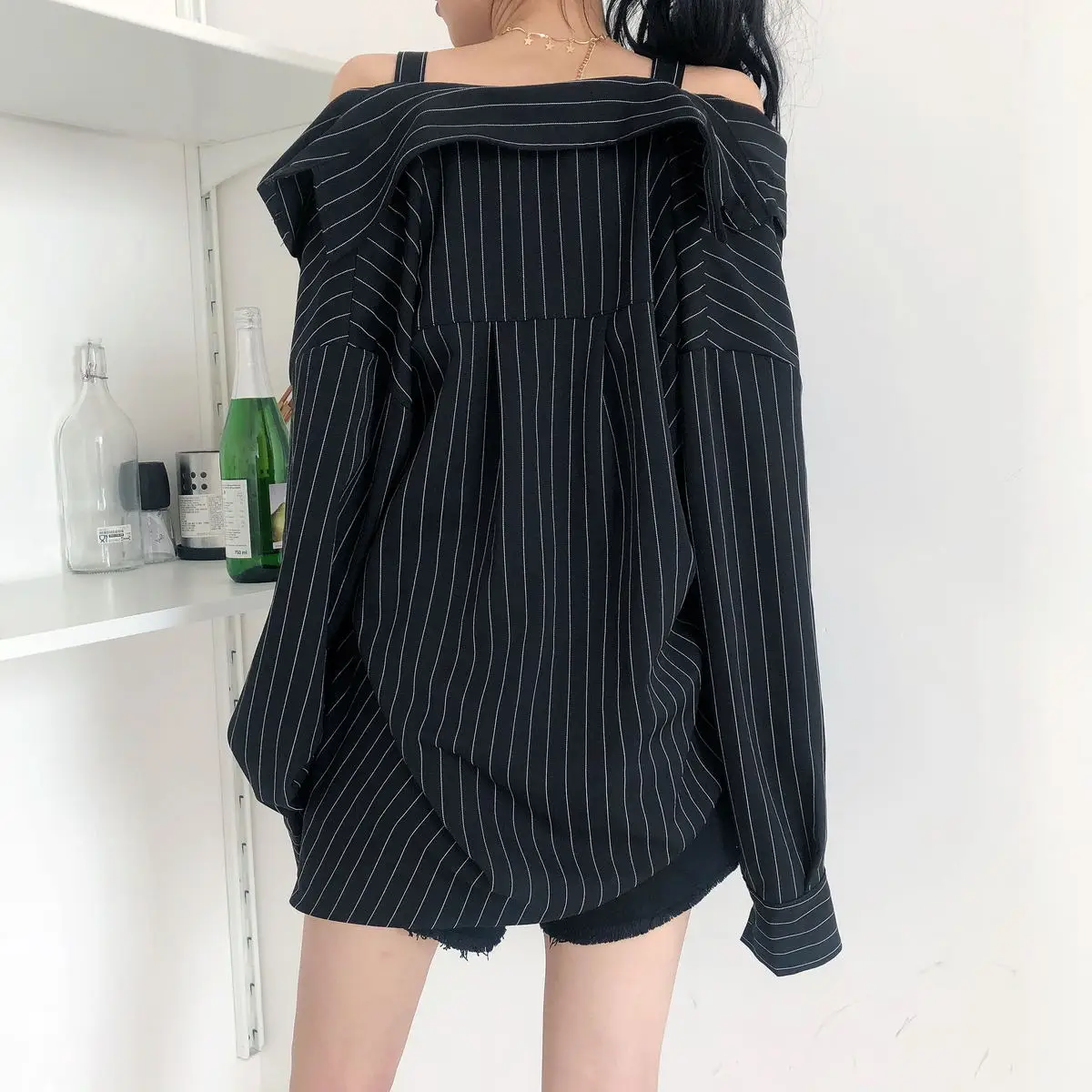 Product Name: LANMREM 2019 nouvelle personnalité de la mode sangle noire rayure verticale épaule dénudée chemise à manches longues chemisier femme Vestido YE22801