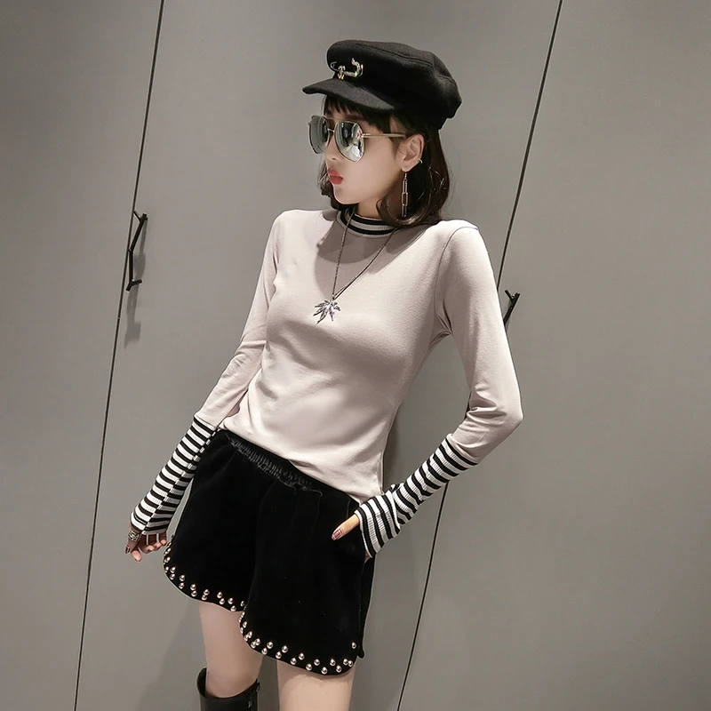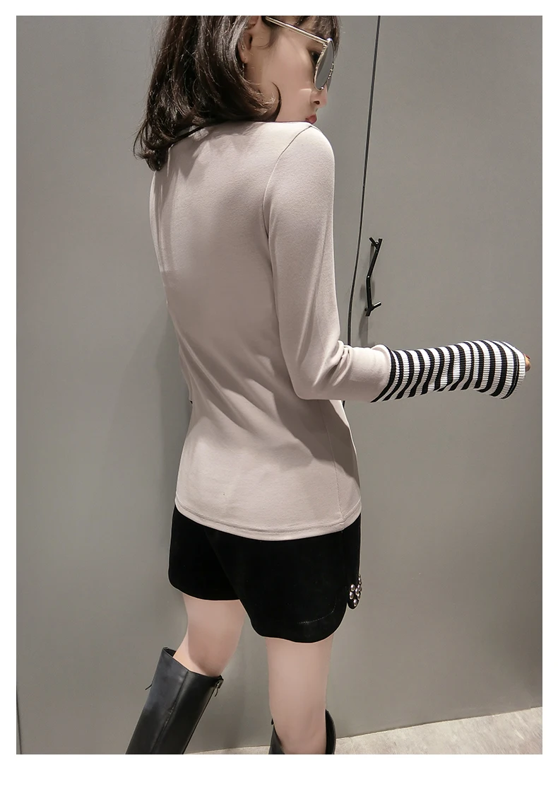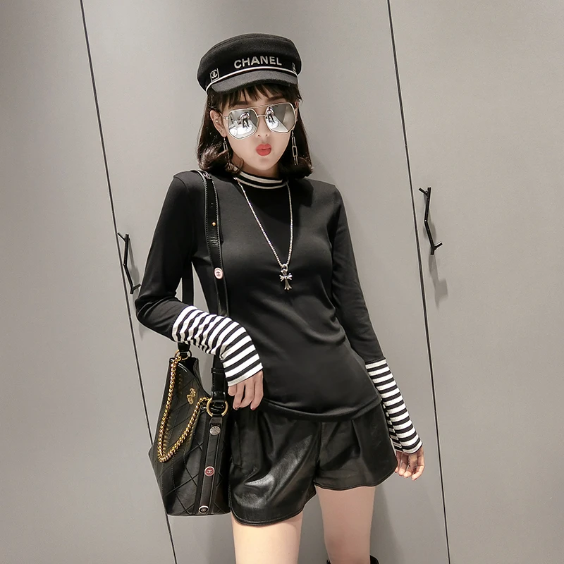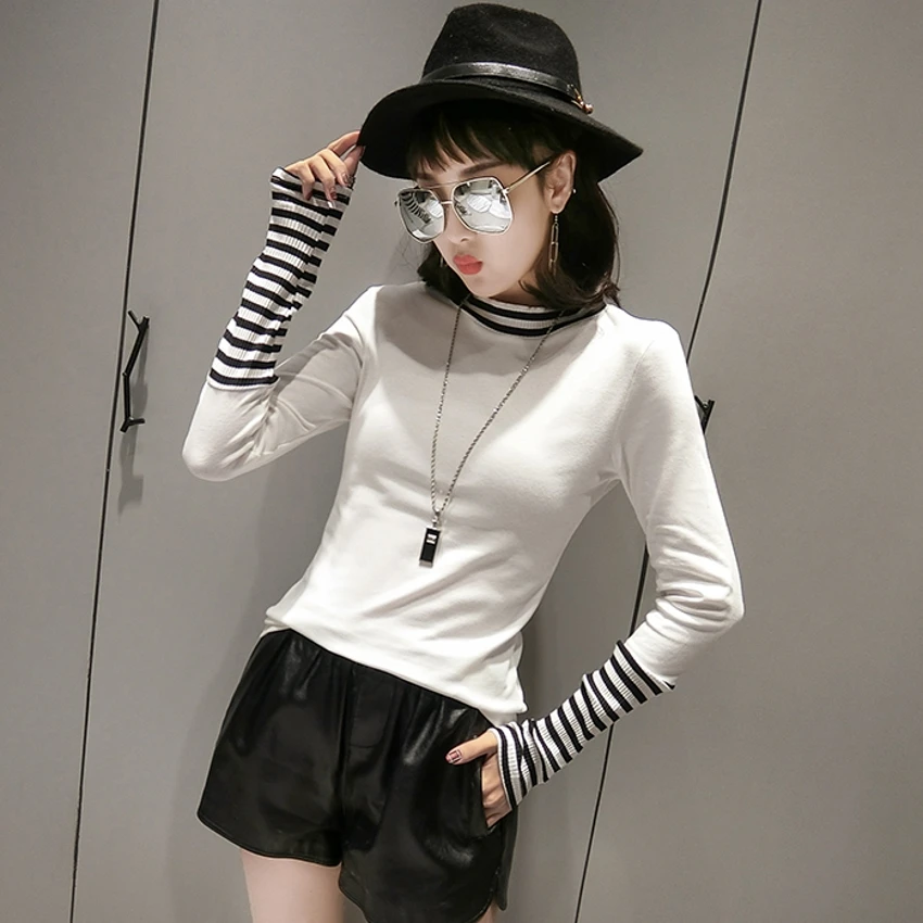 Product Name: Européen rayé Patchwork t shirt 2019 printemps été à manches longues haut vêtements chemise Camiseta Mujer noir blanc gris T97107