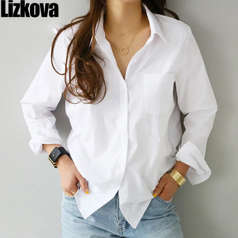 Product Name: 2019 femmes blanc coton à manches longues chemise mince revers chemise tenue décontracté