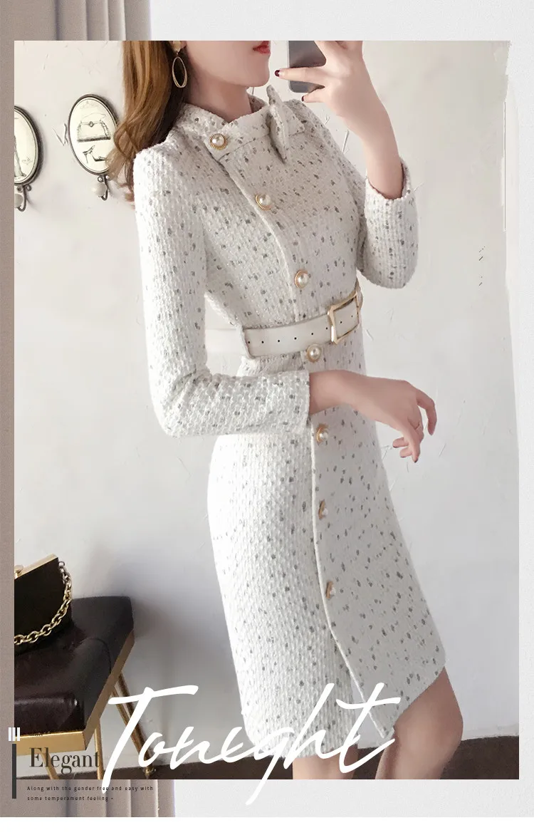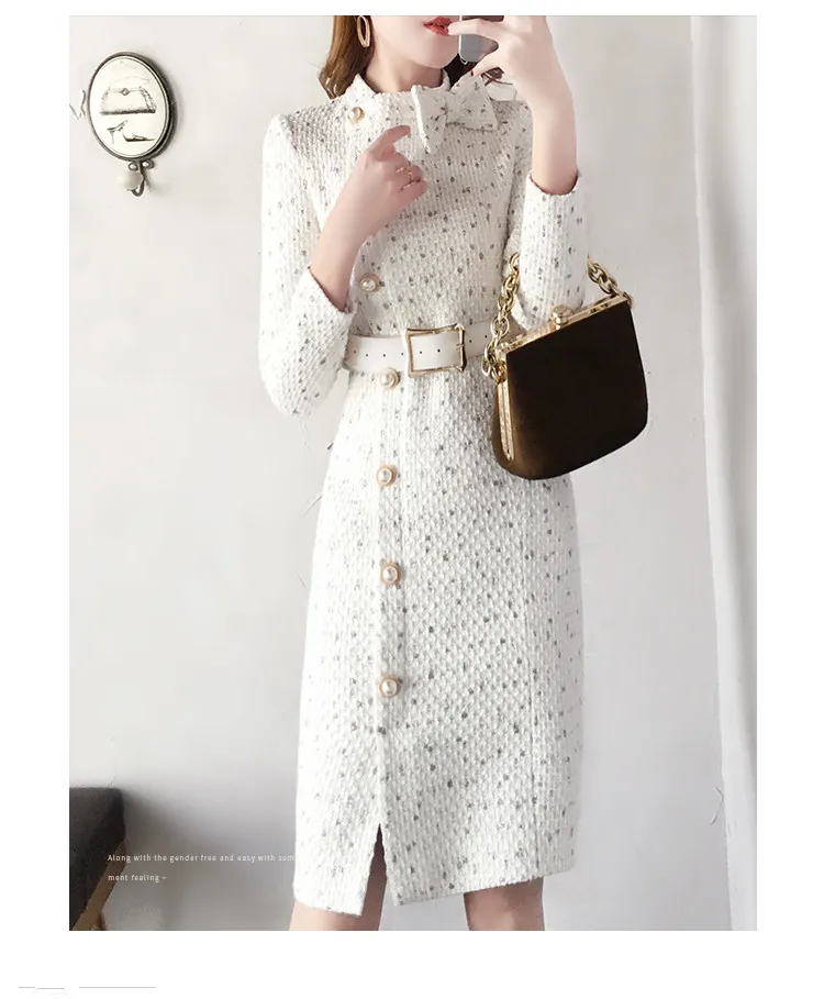 Special Offer 2019 nouveauté automne et hiver piste femmes élégant tweed robe arc col à manches longues femme mode chic robes vestidos Discount 37% Today!