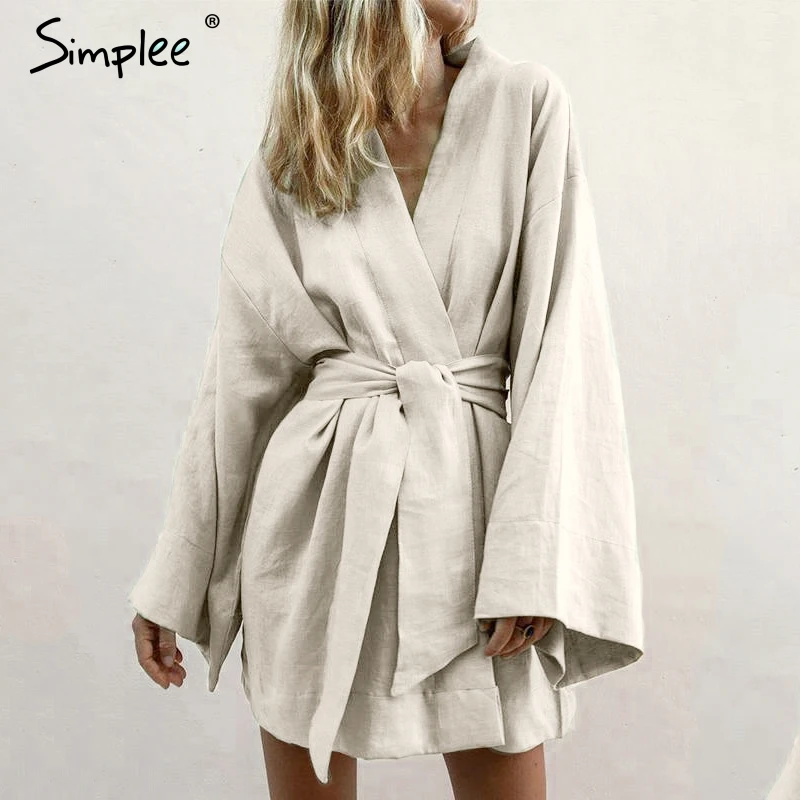 Product Name: Simplee style japonais col en v femmes coton robe solide blanc ceintures robe femme été décontracté vert plage vêtements dame robe 2019