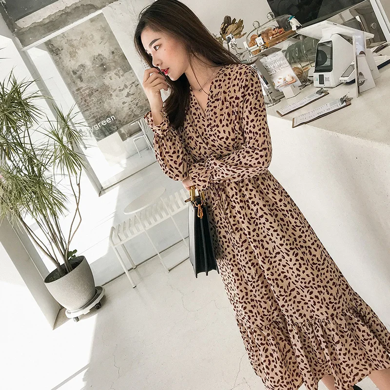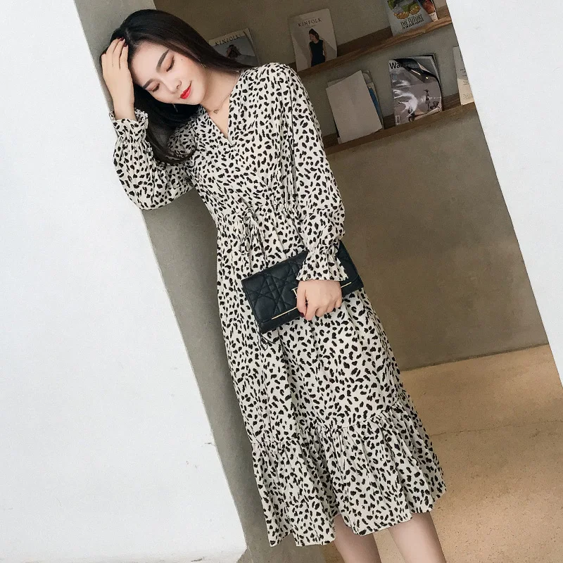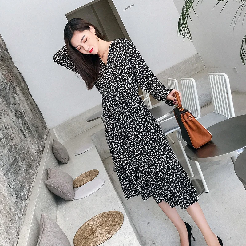 Product Name: Élégant col en v imprimé mousseline de soie robe printemps Flare manches volants élastique Slim taille femme robe mi longue 2019 Chic Vestidos