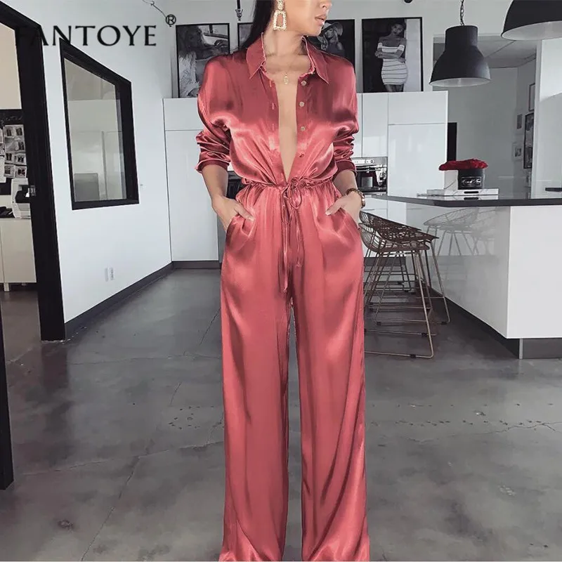 Product Name: Fantoye élégant lâche Satin moulante Bandage combinaison femmes 2019 printemps Sexy solide revers profond col en V combishorts dames Streetwear