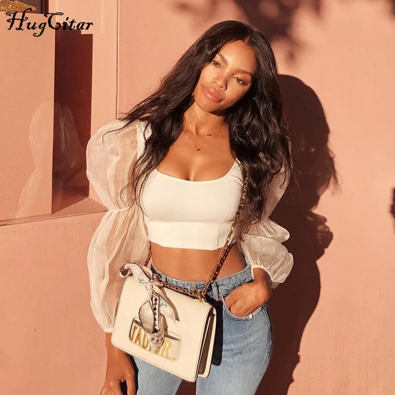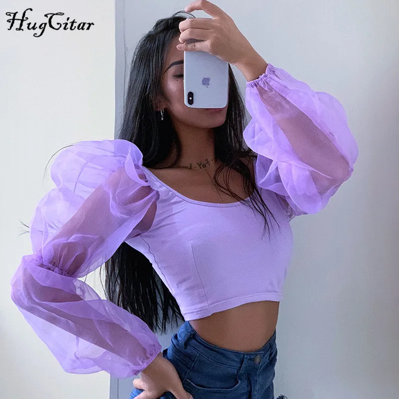 Product Name: Hugcitar bouffée à manches longues dentelle maille transparent patchwork sexy crop hauts 2019 femmes printemps mode fête t shirts streetwear