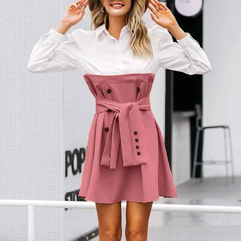 Special Offer Aartiee élégante dames robe 2019 courte blouse Patchwork bouton ceinture ceinture robes pour femmes taille haute robe femme automne nouveau Discount 45% Today!
