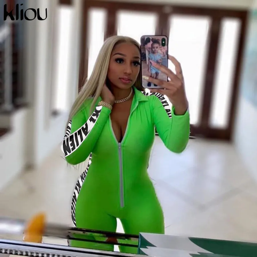 Product Name: Kliou femmes mode combishort fermeture éclair manches longues col roulé skinny barboteuses 2019 lettre imprimer sur le côté femme court body