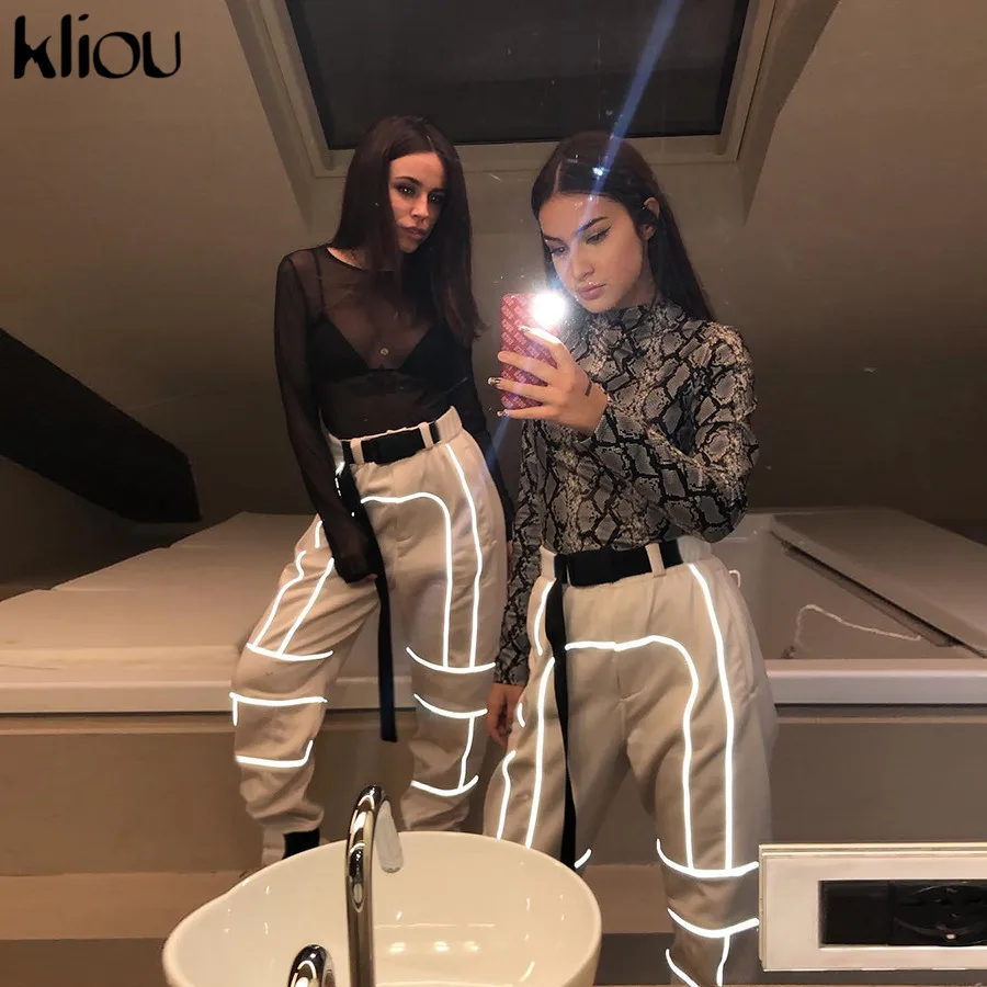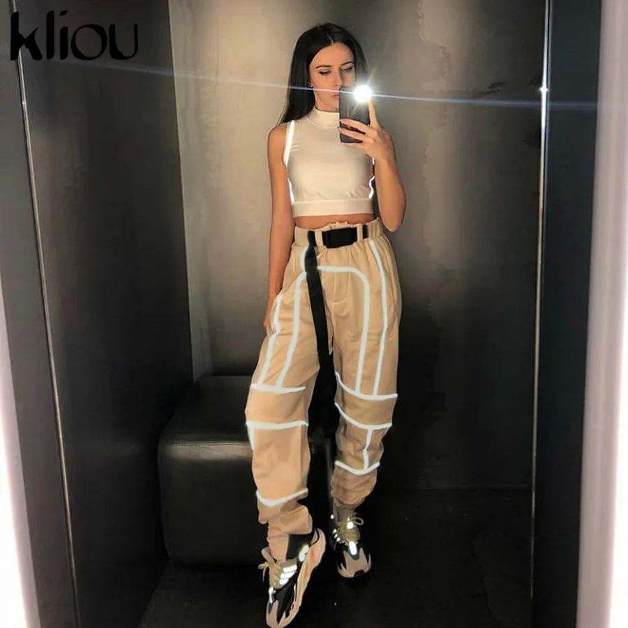 Product Name: Kliou femmes mode rue réfléchissant patchwork cargo pantalon 2019 nouveauté veste pour homme avec ceintures poches tricoté pantalon