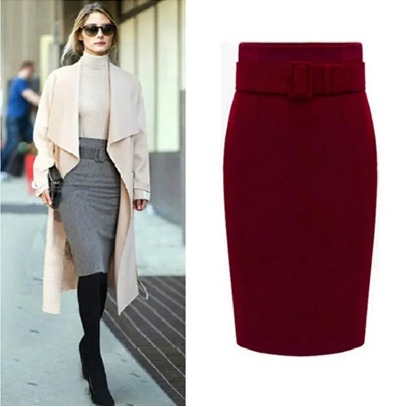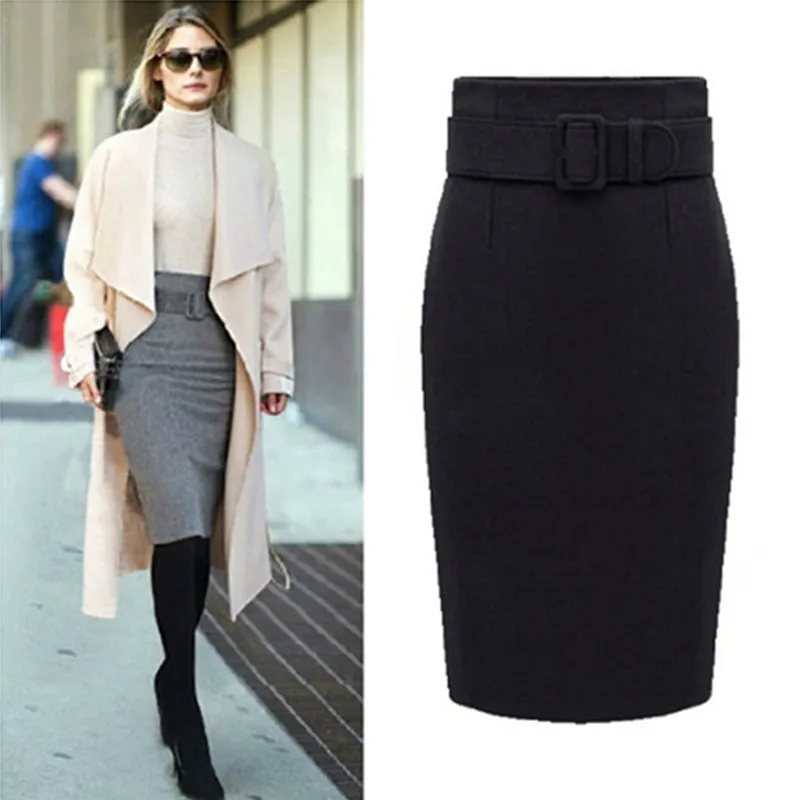 . (30% Off) Achat Neophil 2019 hiver gris épais laine Midi jupes crayon grande taille décontracté Slim taille haute ceinture bureau travail porter Saias S1205 Pas Cher Prix.