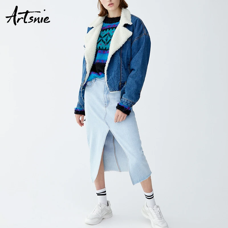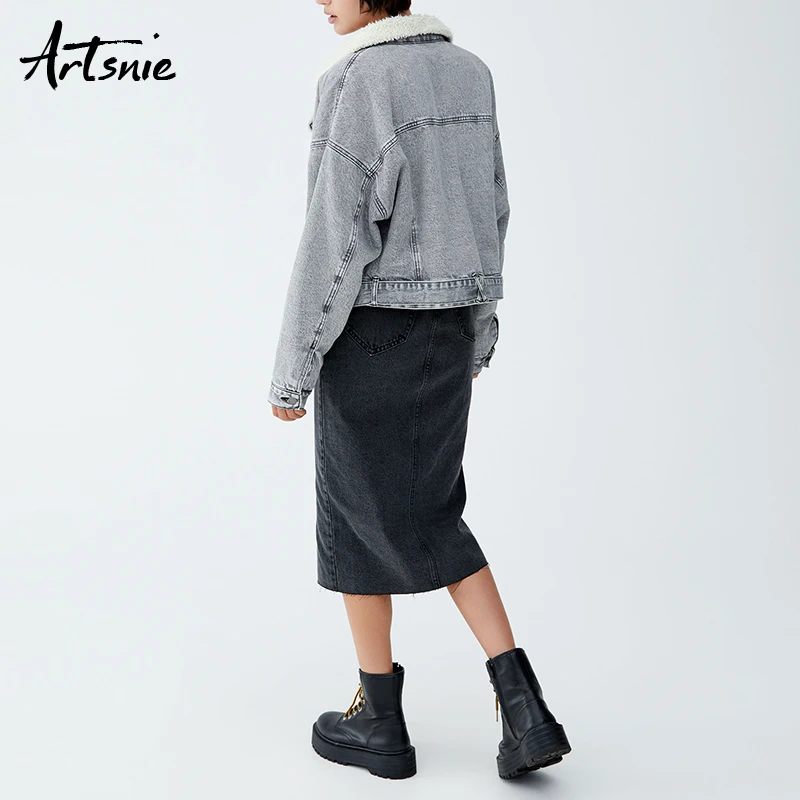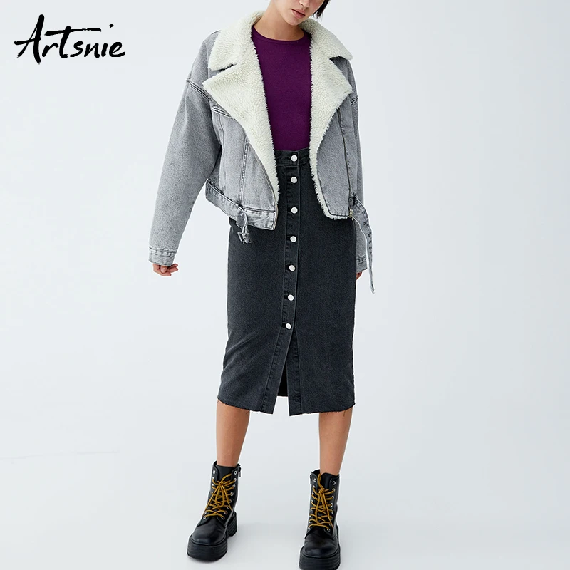 Special Offer Artsnie automne 2018 fausse fourrure doublé Denim vestes femmes hiver tourner vers le bas col ceintures décontracté chaud épais filles manteaux Chaqueta Discount 0% Today!