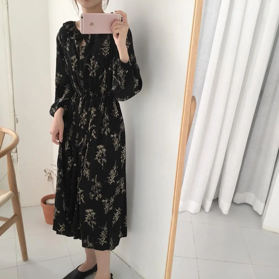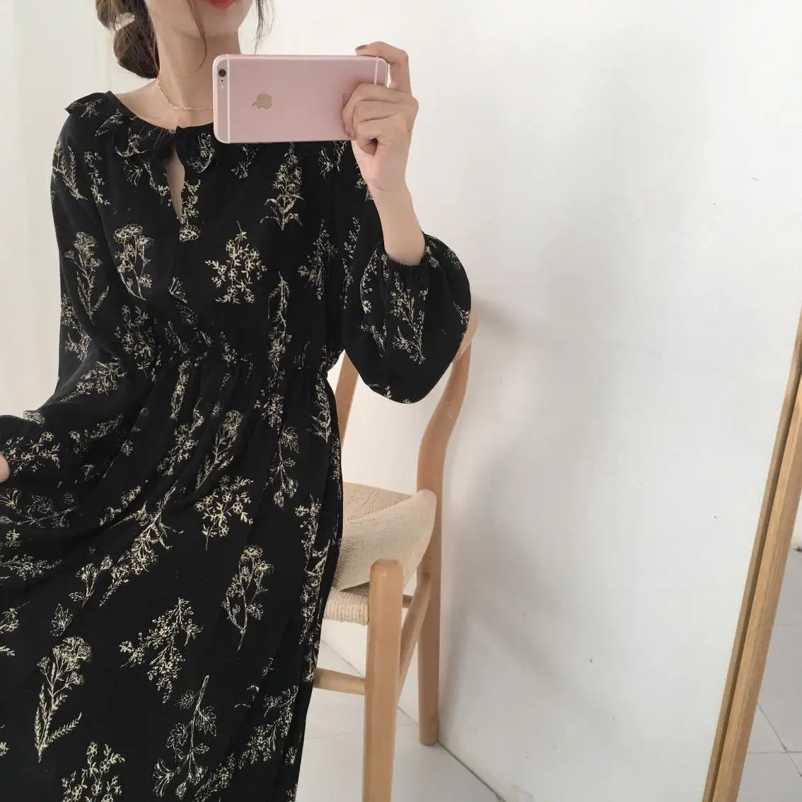 Product Name: 2019 Design robes femmes chaudes mode à manches longues Style coréen Slim taille une ligne Floral imprimé Vintage robe à volants longue 202