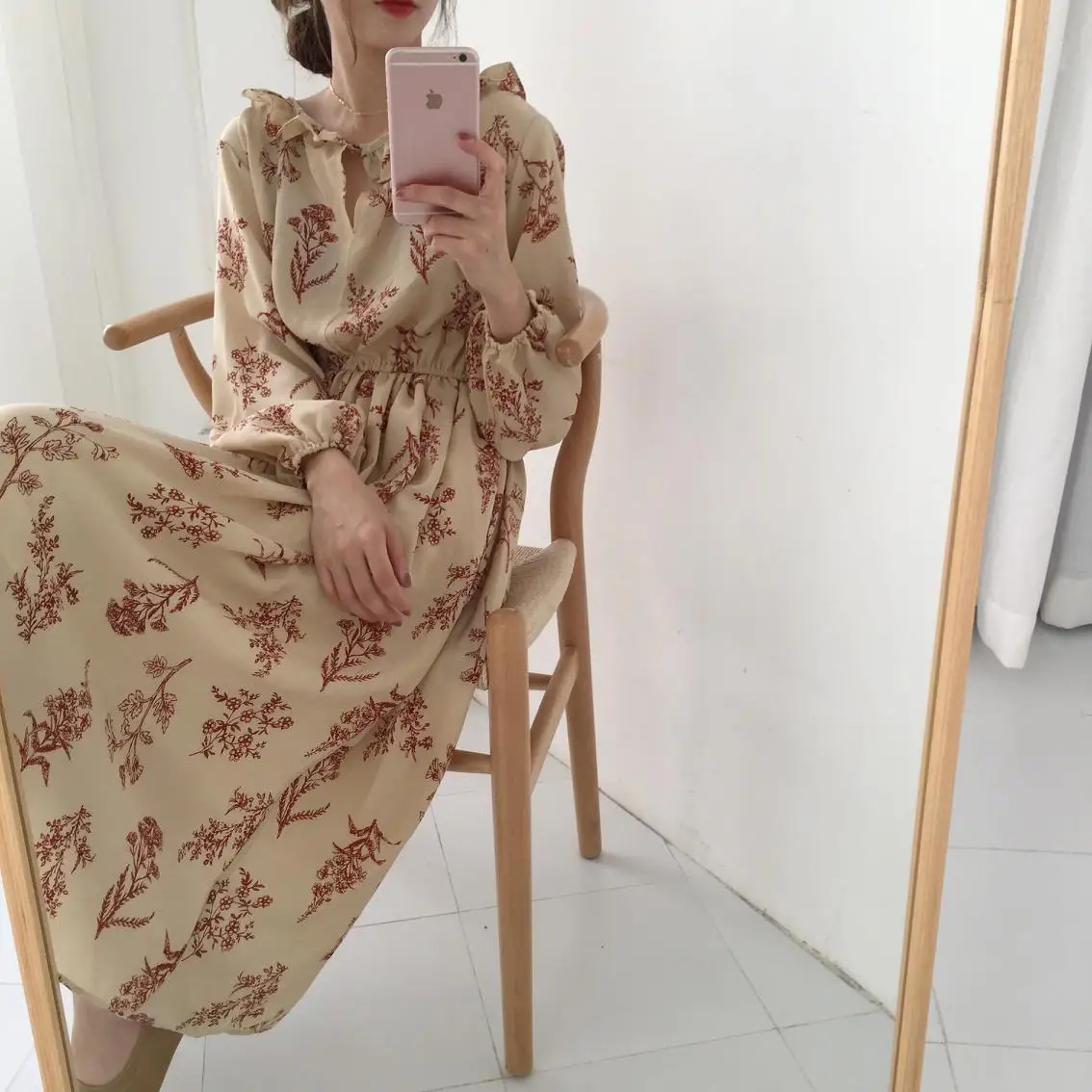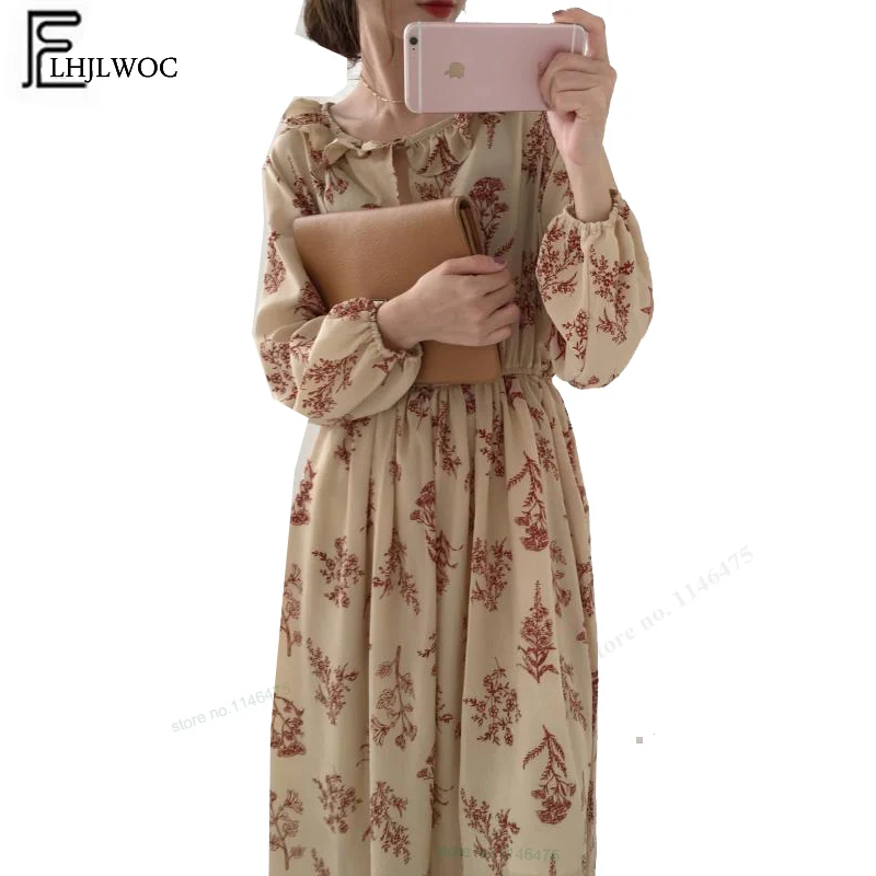 Special Offer 2019 Design robes femmes chaudes mode à manches longues Style coréen Slim taille une ligne Floral imprimé Vintage robe à volants longue 202 Discount 13% Today!