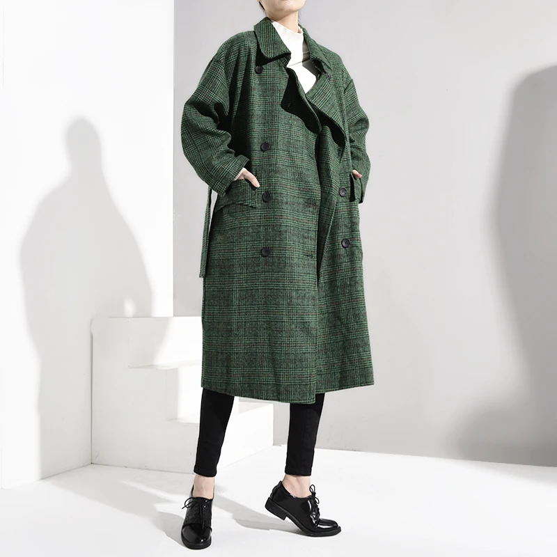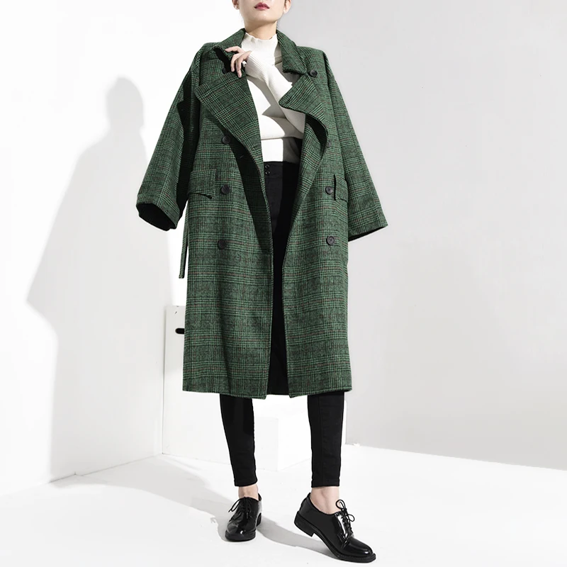 Special Offer LANMREM 2018 mode automne Double boutonnage Notech décontracté grande taille longue Type vert Plaid femmes manteau de laine UA26406 Discount 30% Today!