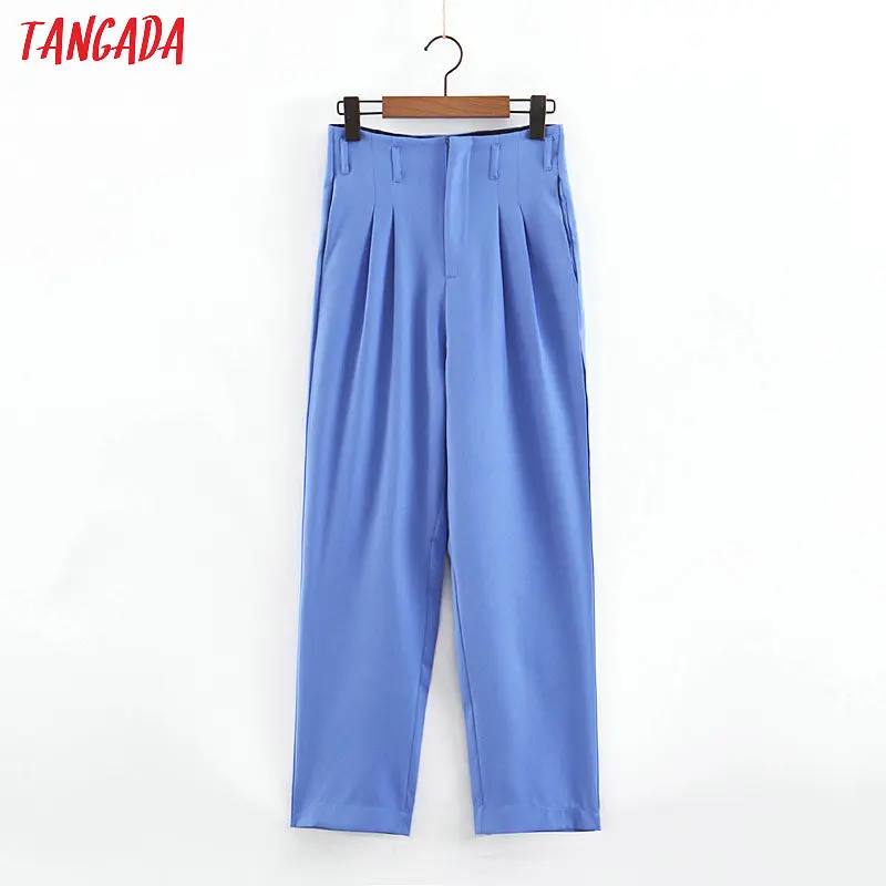 Product Name: Tangada femmes bleu plissé pantalons droits boutons 2019 mode dames costume pantalon taille haute pleine longueur chic pantalon SL235