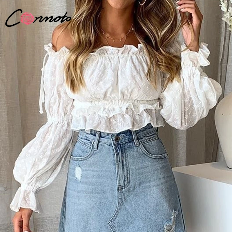 Special Offer Conmoto Vintage blanc broderie femmes Crop hauts et Blouse 2019 nouveau hors épaule Slash cou Blouse fille lanterne manches chemise Discount 32% Today!