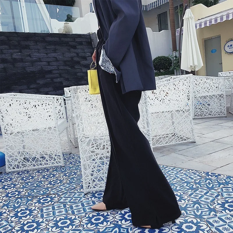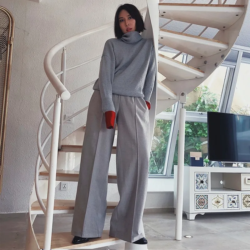 Special Offer Deuxtwinstyle coréen large jambe pantalon pour femmes taille haute élastique bouton fendu gris femmes pantalon Plus épais 2019 automne hiver Discount 32% Today!