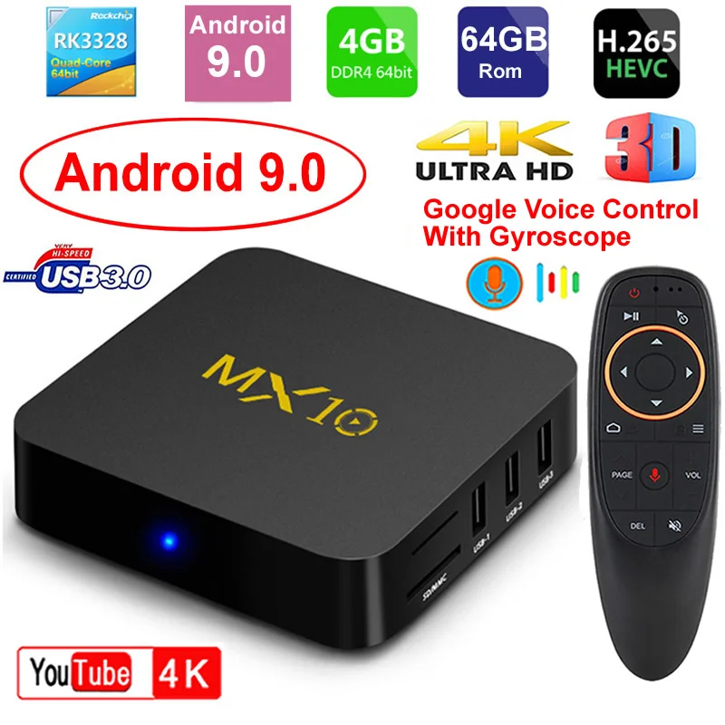 Product Name: MX10 Smart TV BOX Android 9.0 Rockchip RK3328 DDR4 4GB Ram 64GB Rom IPTV décodeur intelligent 4K USB 3.0 HDR H.265 boîtier de lecteur multimédia