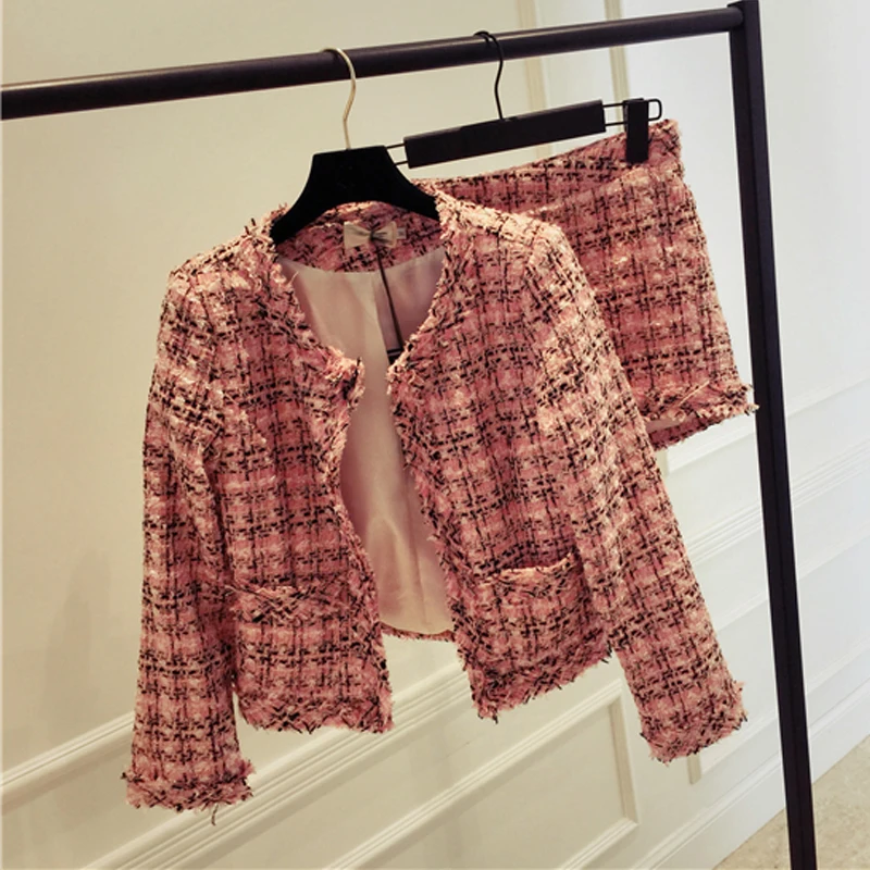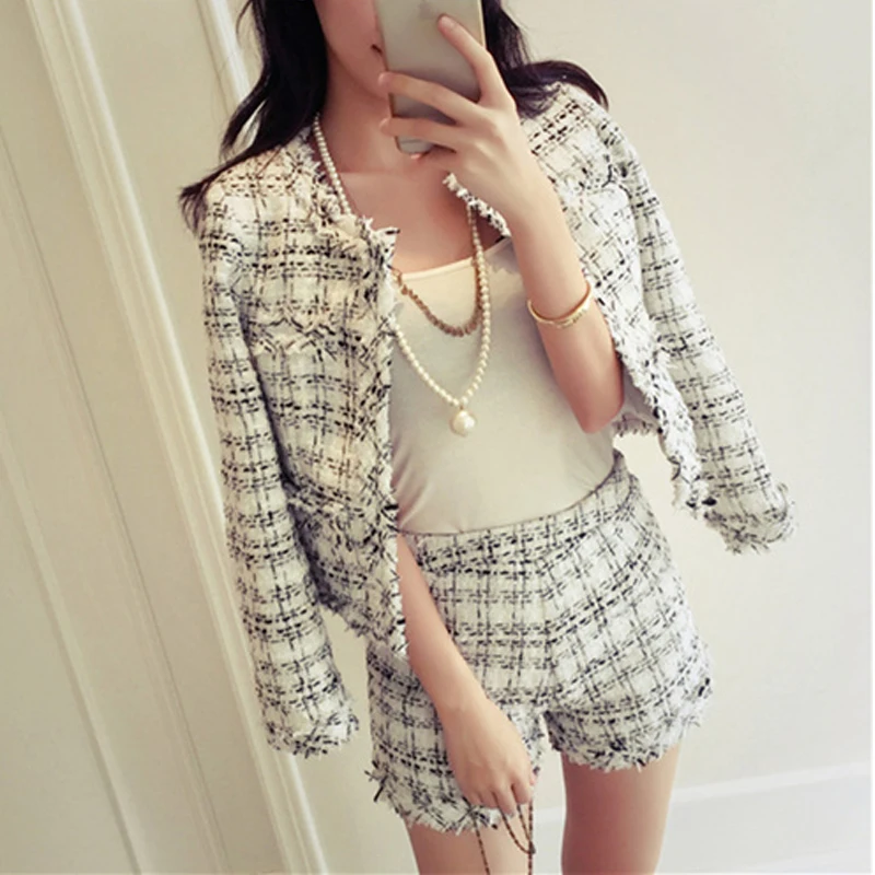 Special Offer 2019 automne hiver Tweed 2 pièces ensemble femmes mince Plaid court ensemble mode frangée garniture veste manteau + glands costume court Discount 35% Today!